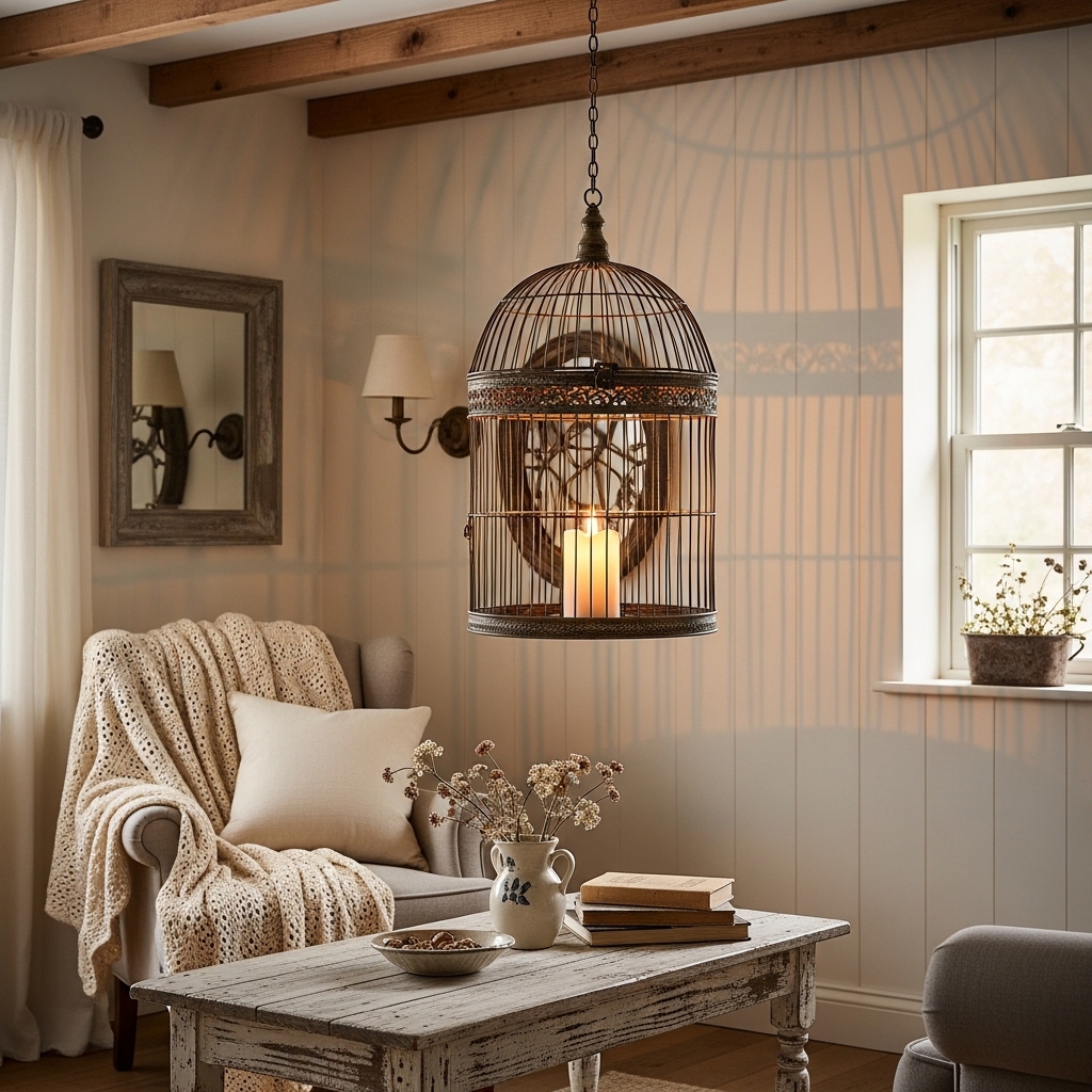 Hang a vintage birdcage from the ceiling. Place a battery-operated candle inside. The light will flicker through the bars.