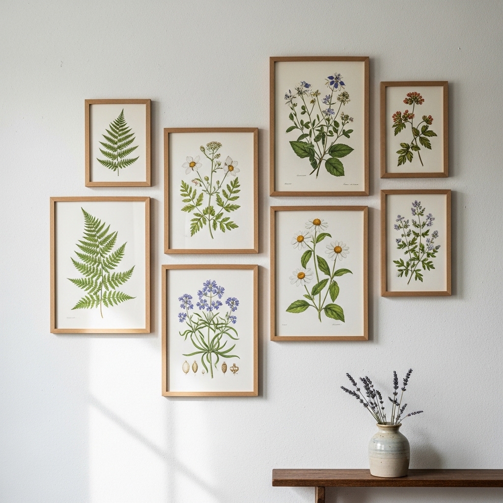 Find vintage botanical illustrations online. Print them on cream paper. Frame them in simple wood frames. Hang them in a cluster.