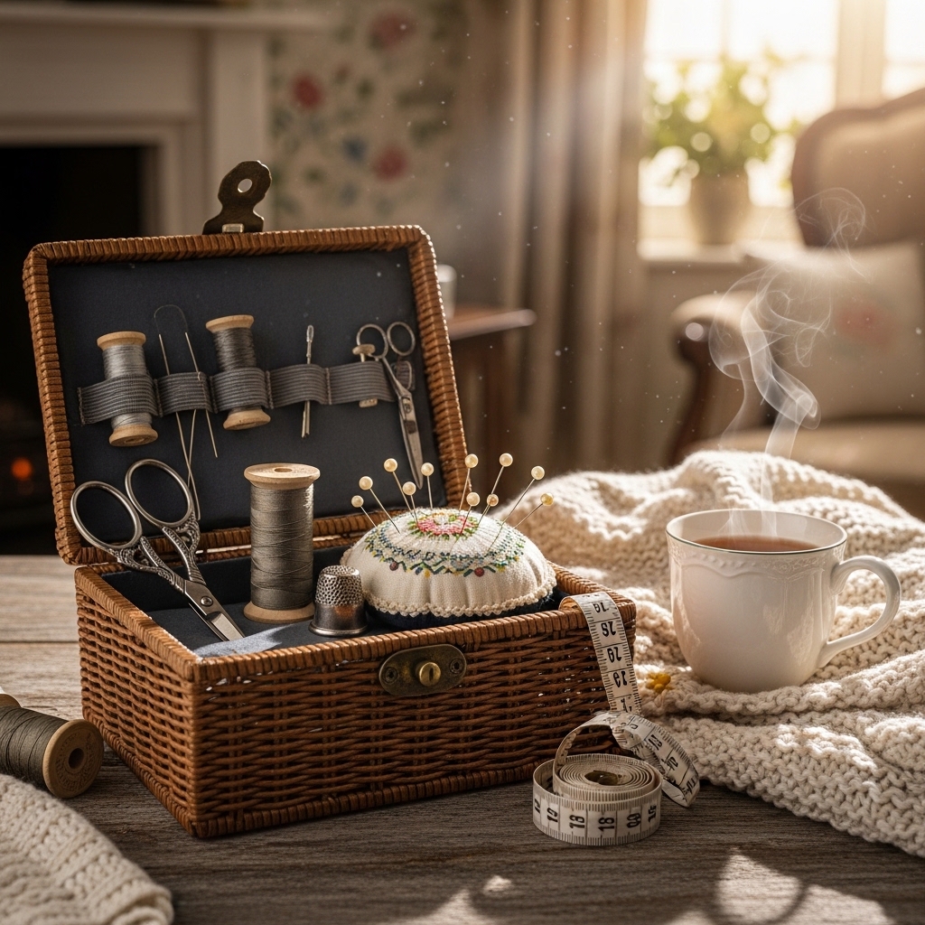 Place an old sewing basket on a side table. Leave it open. The spools of thread and scissors should be visible.