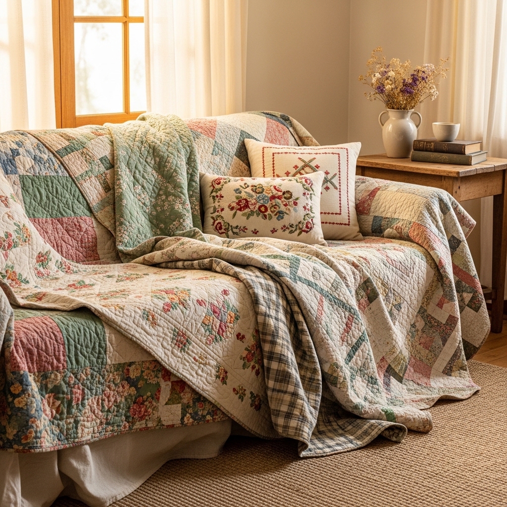 Drape a quilt over the back of the sofa. Fold another over the arm. Layer a third on a nearby chair. The fabrics should be mismatched. The patterns should be varied.