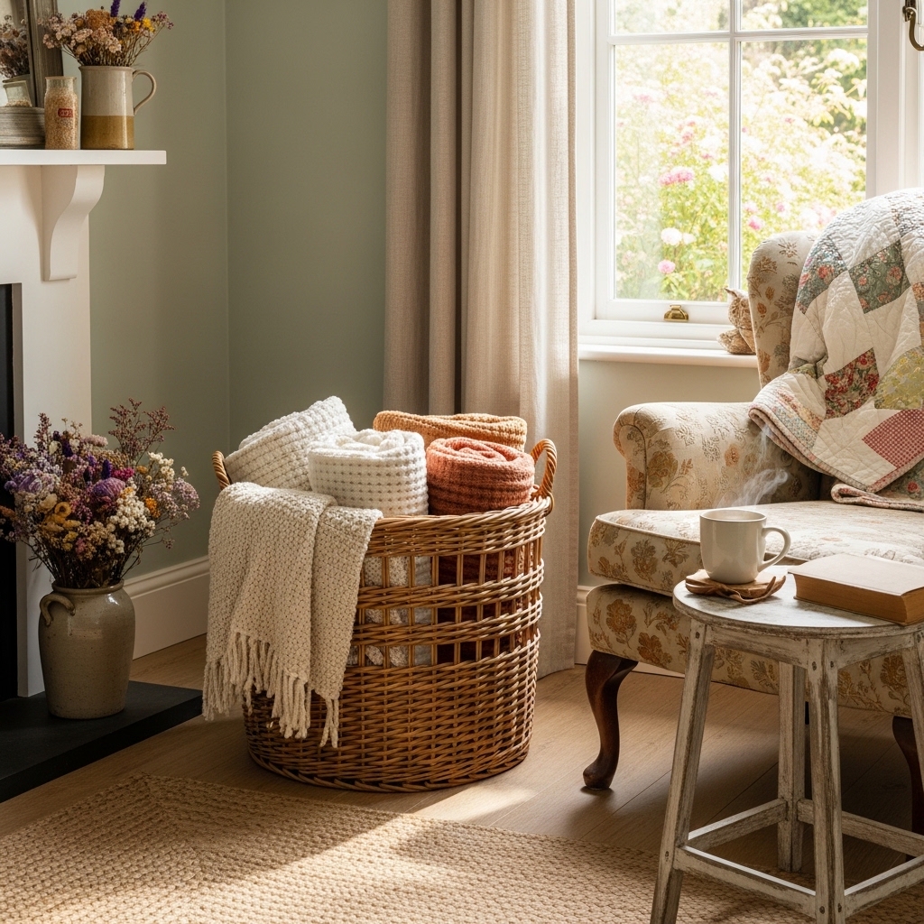 Fill a large basket with quilts and wool throws. Place it next to the sofa. The basket adds texture.
