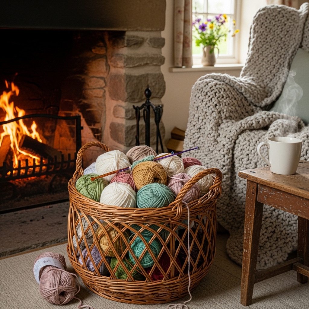 Fill a woven basket with balls of wool yarn in cream, rose, and sage. Place it next to the fireplace. The yarn will be ready for knitting.