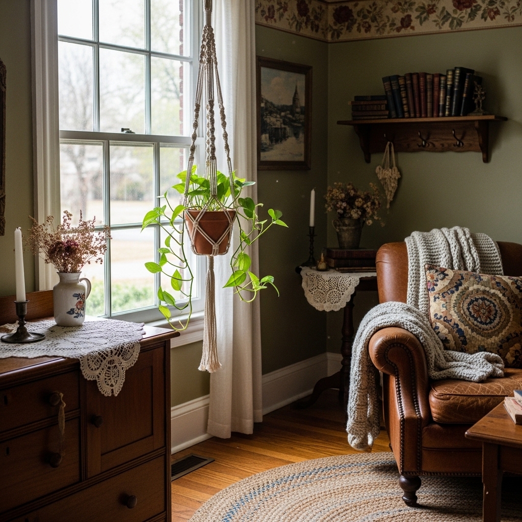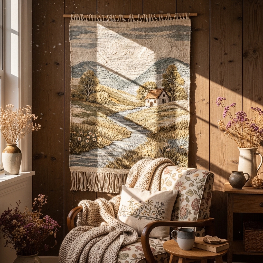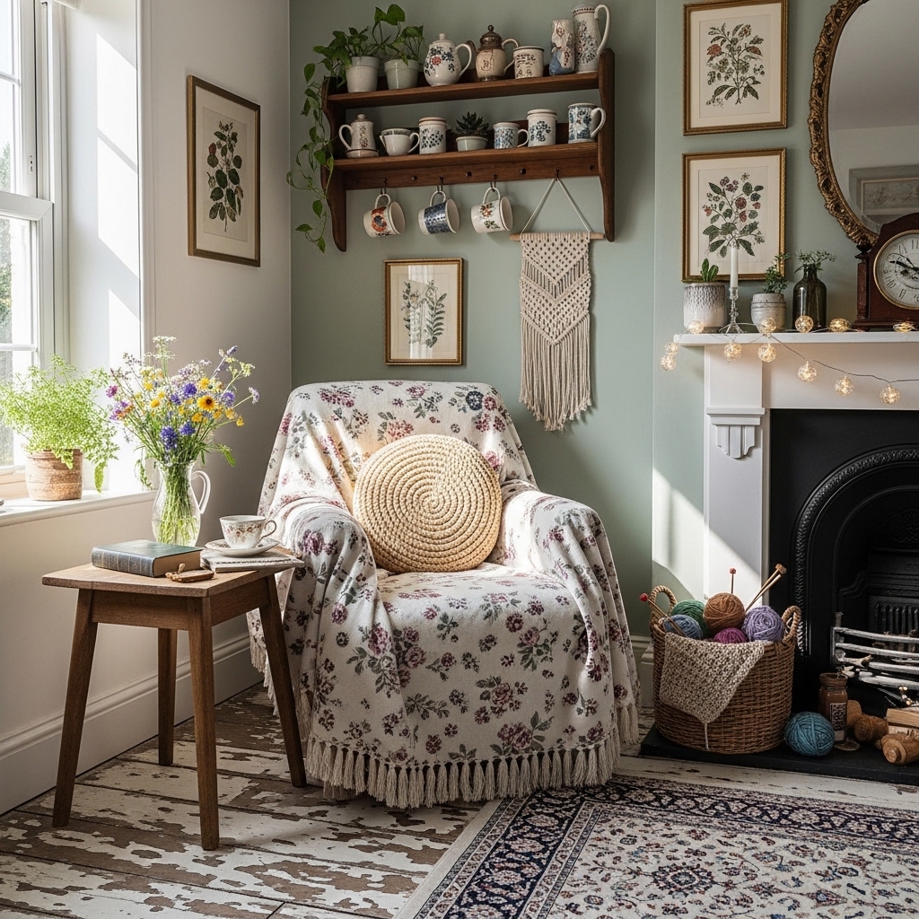Cottagecore decor is about simplicity, nostalgia, and a deep connection to nature. Dried flowers in vintage jars. Layered quilts on the sofa. Botanical prints on the walls. Baskets of yarn by the fireplace. Woven tapestries. Vintage books arranged by color. Wildflowers in ceramic pitchers. Macrame plant holders. Milk glass collections. Potted herbs on windowsills. Dried orange garlands. Vintage handkerchiefs in embroidery hoops. Woven baskets for blankets. Ceramic mushrooms on shelves. Floral garlands across mantels. Vintage sewing baskets. Stacked old suitcases. Birdcages with candles. Needlepoint pillows. Leather journals on coffee tables.