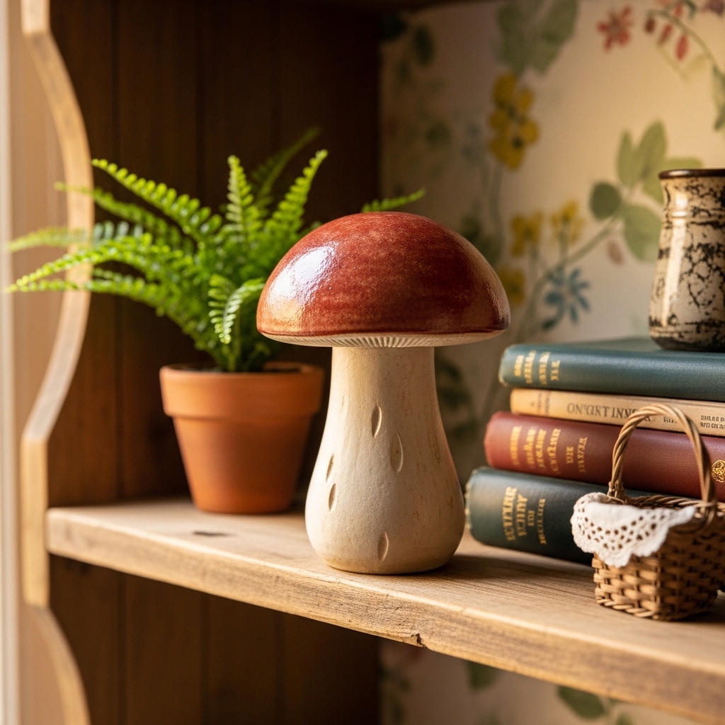 Find a ceramic mushroom at a craft fair or vintage shop. Place it on a bookshelf. The mushroom should be small. The glaze should be matte.