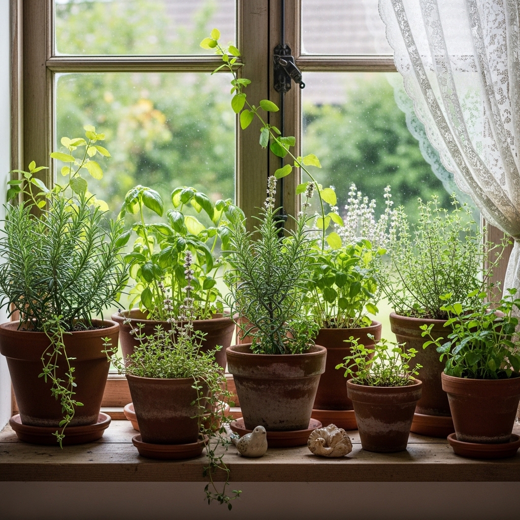 Plant basil, thyme, and rosemary in small terracotta pots. Line them on the kitchen windowsill. Snip the leaves for cooking.