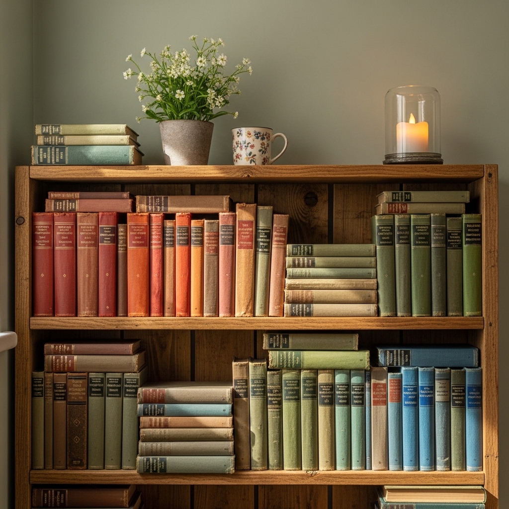 Arrange vintage books on a shelf by color. Cream, sage, rose, and blue. The spines should be worn. The pages should be yellowed.