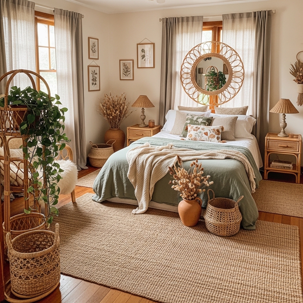 Rattan chairs, wicker baskets, or woven accessories bring natural texture to a cottagecore bedroom. These elements add rustic charm and functionality.
