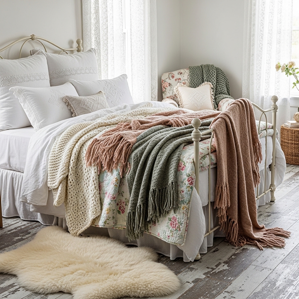 Layering soft textiles like knitted blankets, lace throws, and velvet cushions adds depth and comfort to the bedroom.