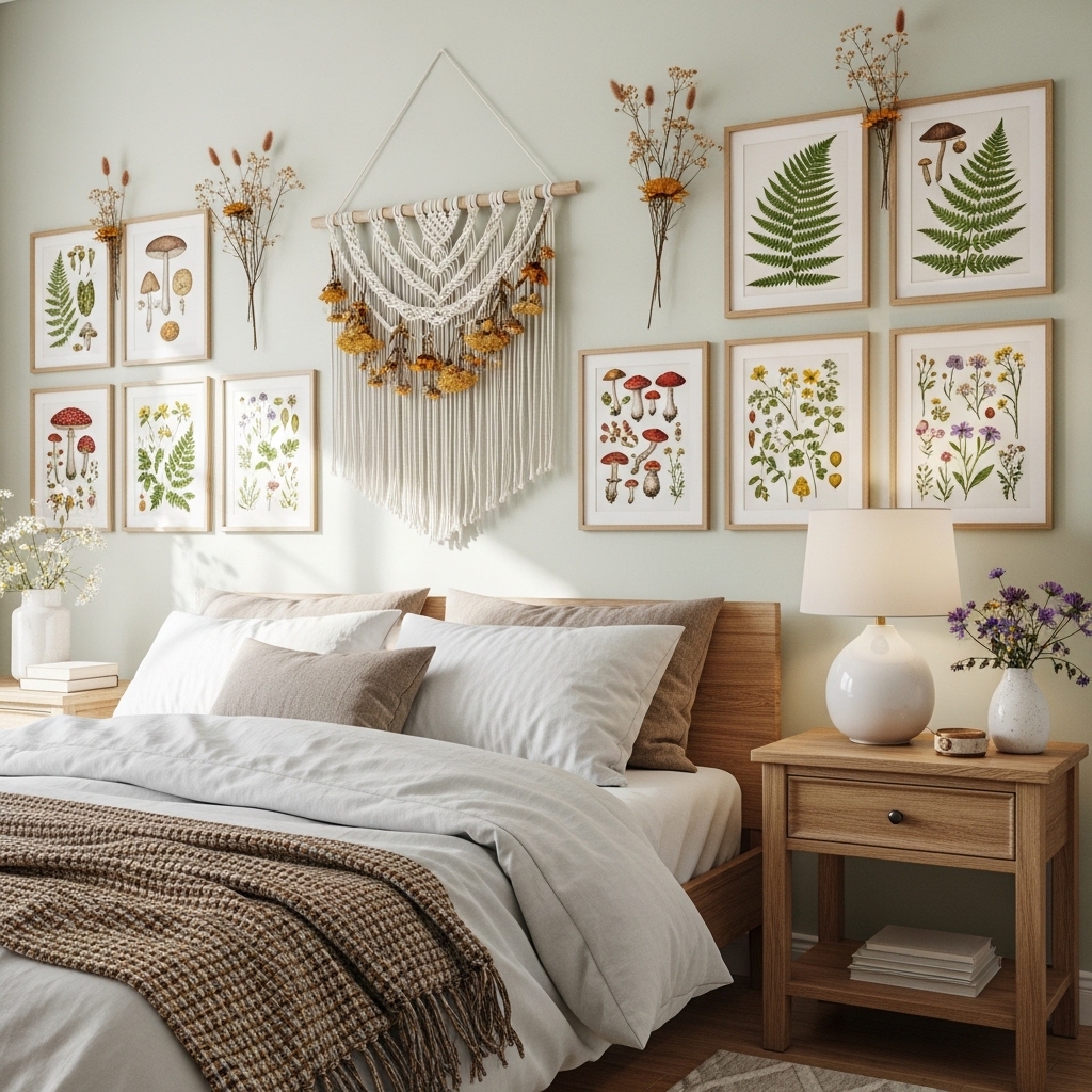 Incorporate botanical prints, pressed flowers, or landscape paintings to bring the outdoors in.