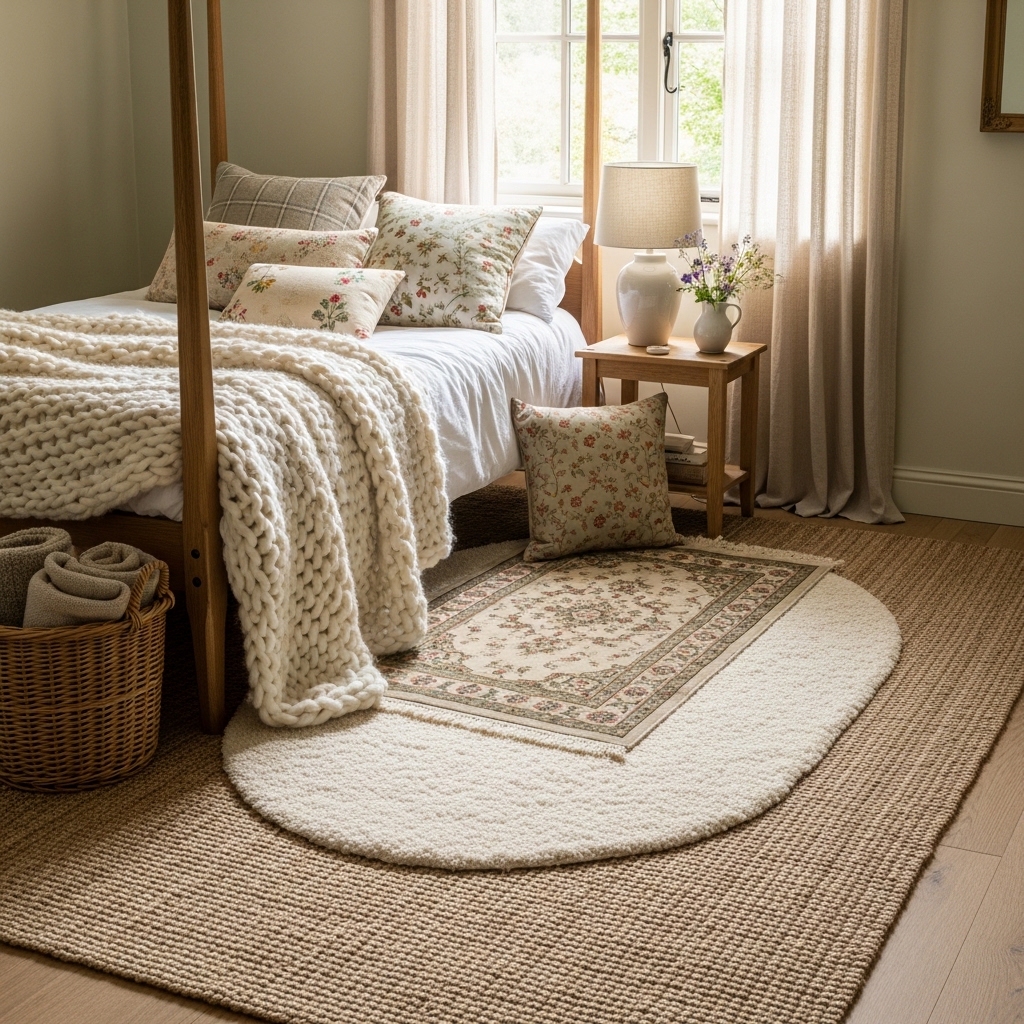 Layering rugs adds warmth and texture to a cottagecore bedroom. Soft wool or jute rugs work well underfoot while enhancing the cozy feel.