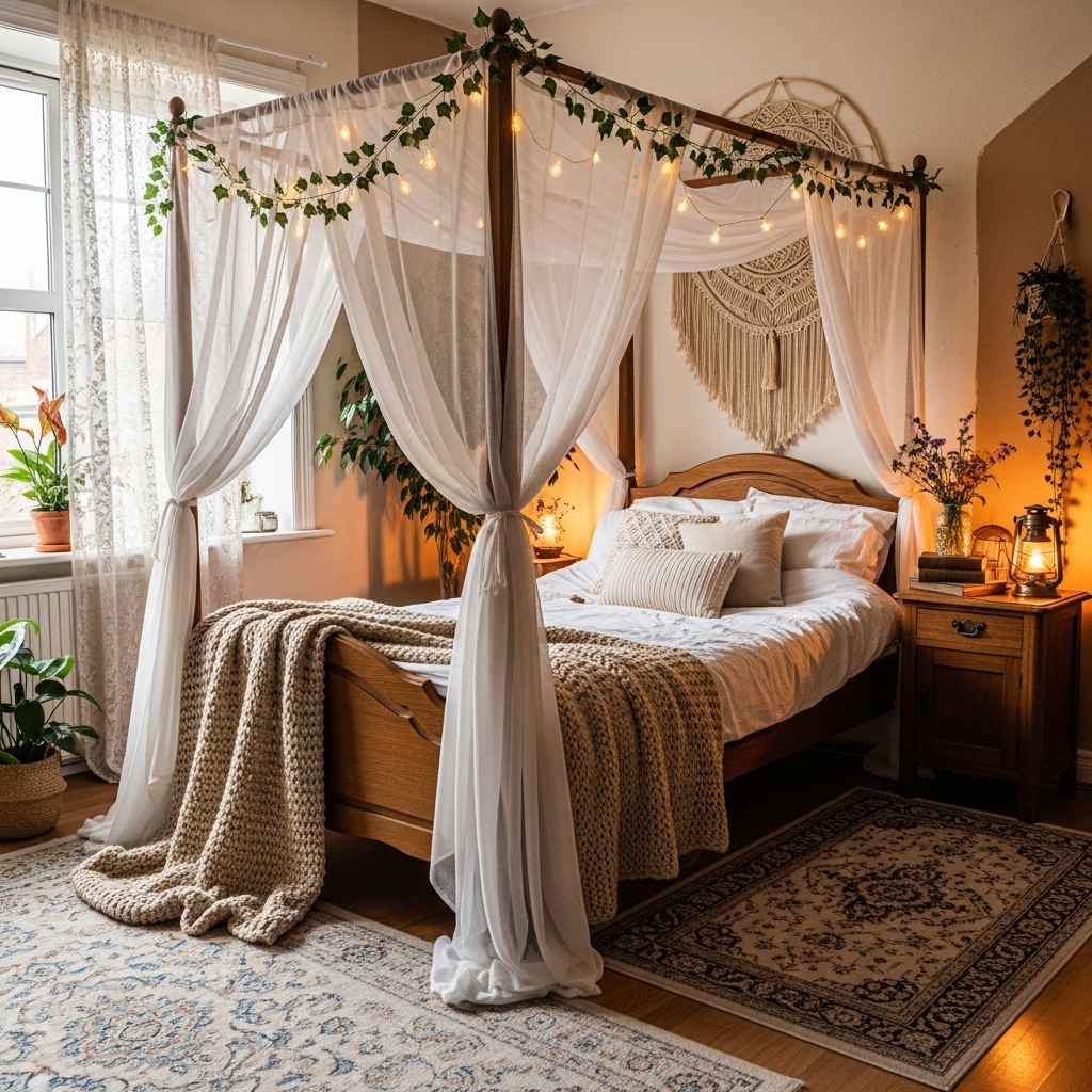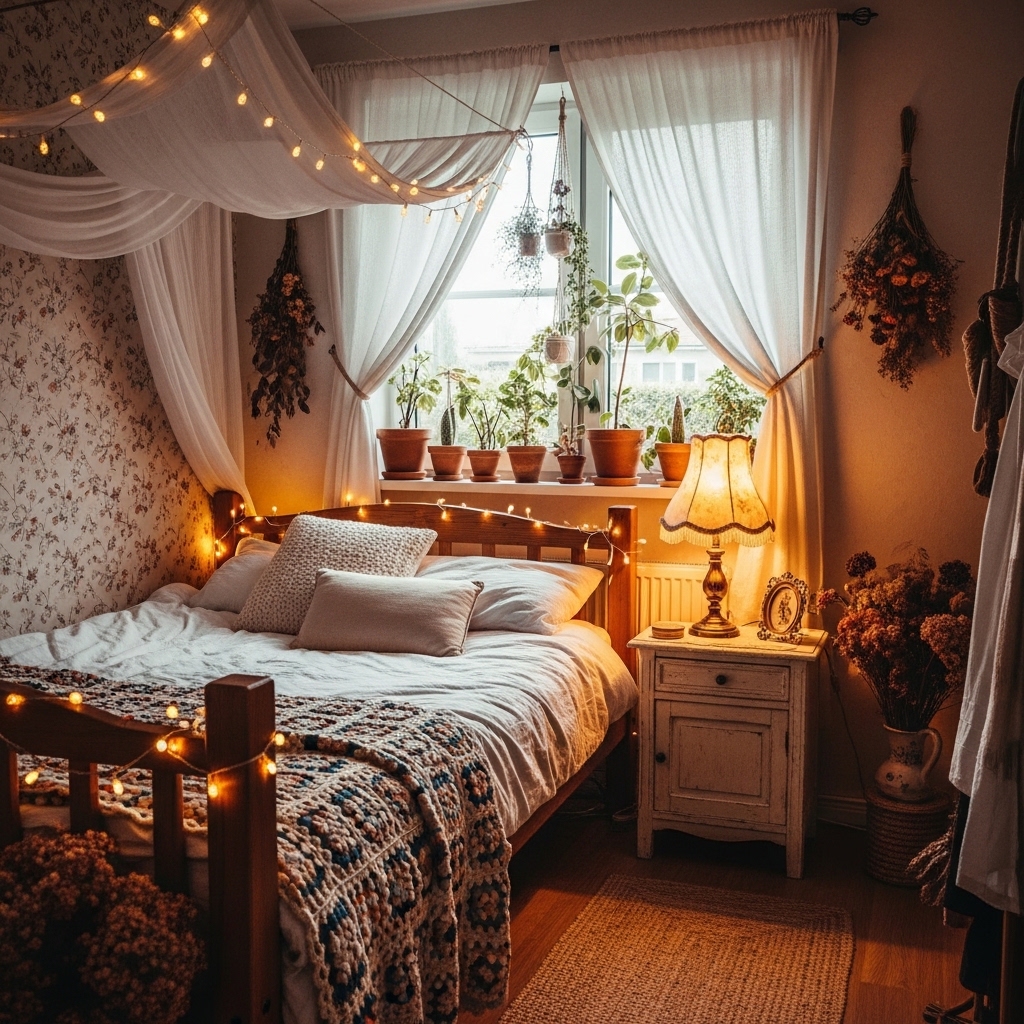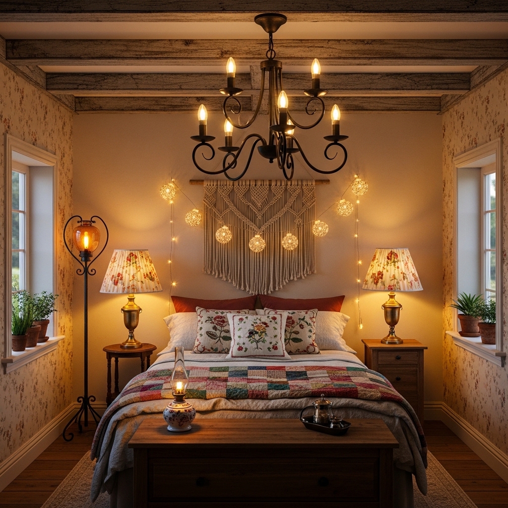Lighting like vintage chandeliers, brass bedside lamps, or fairy string lights adds warmth and charm.