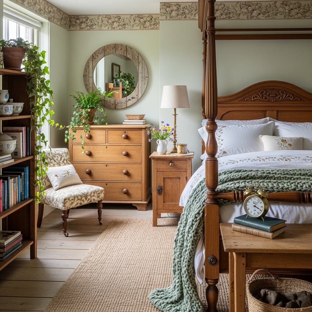 Incorporate personal or antique items like old books, clocks, or ceramics to give the bedroom character.