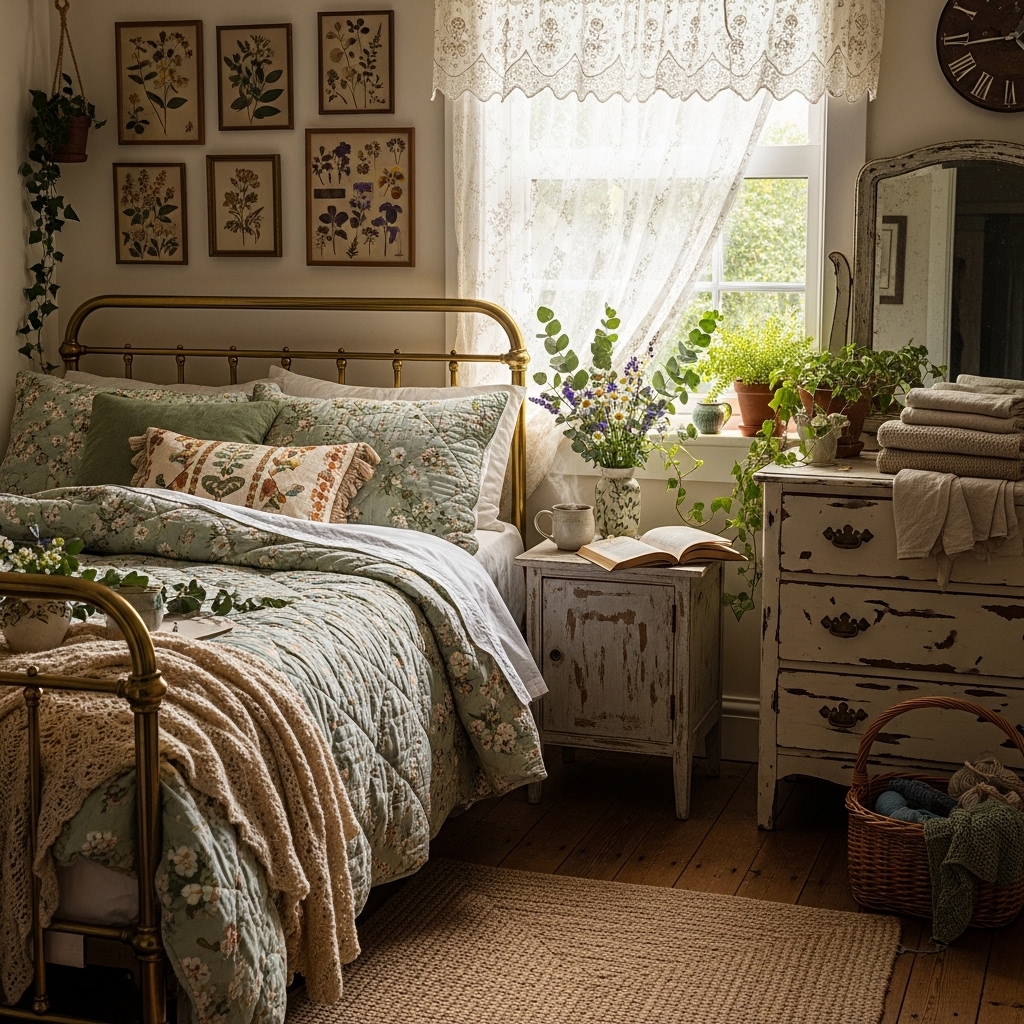 Lace curtains or delicate drapes enhance the romantic, airy feel of a cottagecore bedroom.
