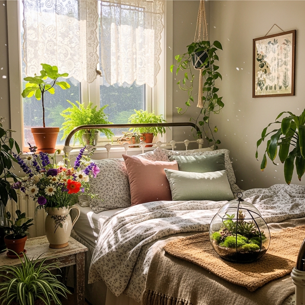 Plants and fresh flowers bring life and a natural element to the bedroom. Potted herbs or small floral arrangements enhance the cottagecore aesthetic.