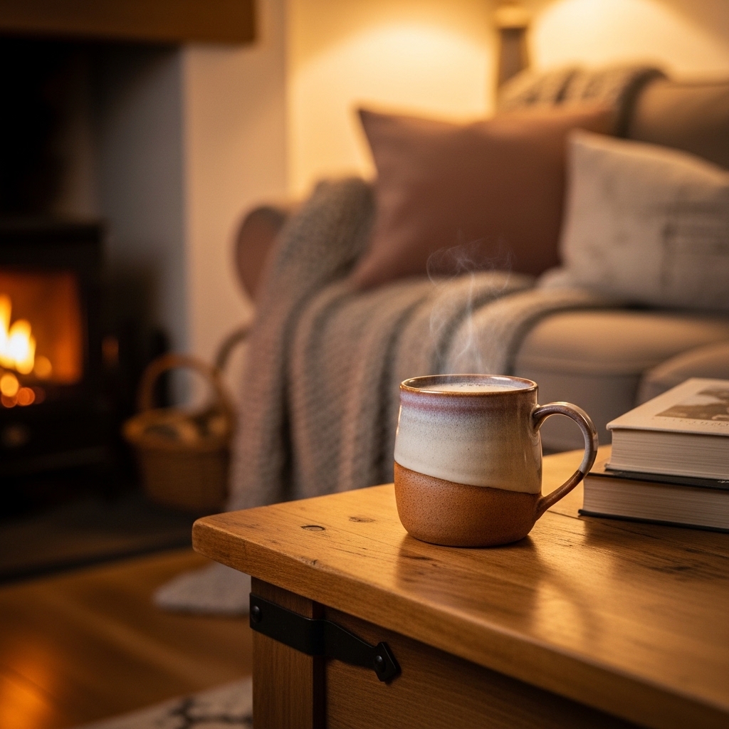 Leave a ceramic mug on the coffee table. The mug should be handmade. The glaze should be imperfect.
