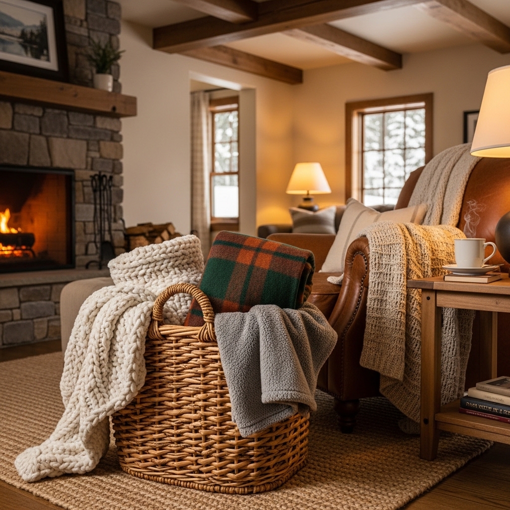 Fill a large basket with wool and flannel blankets. Place it next to the sofa. The blankets will be ready.