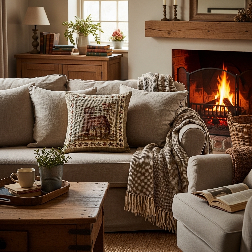 Place a needlepoint pillow on the sofa. The design should be floral or pastoral. The colors should be muted.