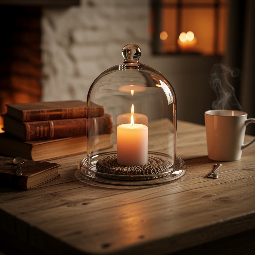 Place a votive candle on a stand. Cover it with a glass cloche. The flame will flicker behind the glass.