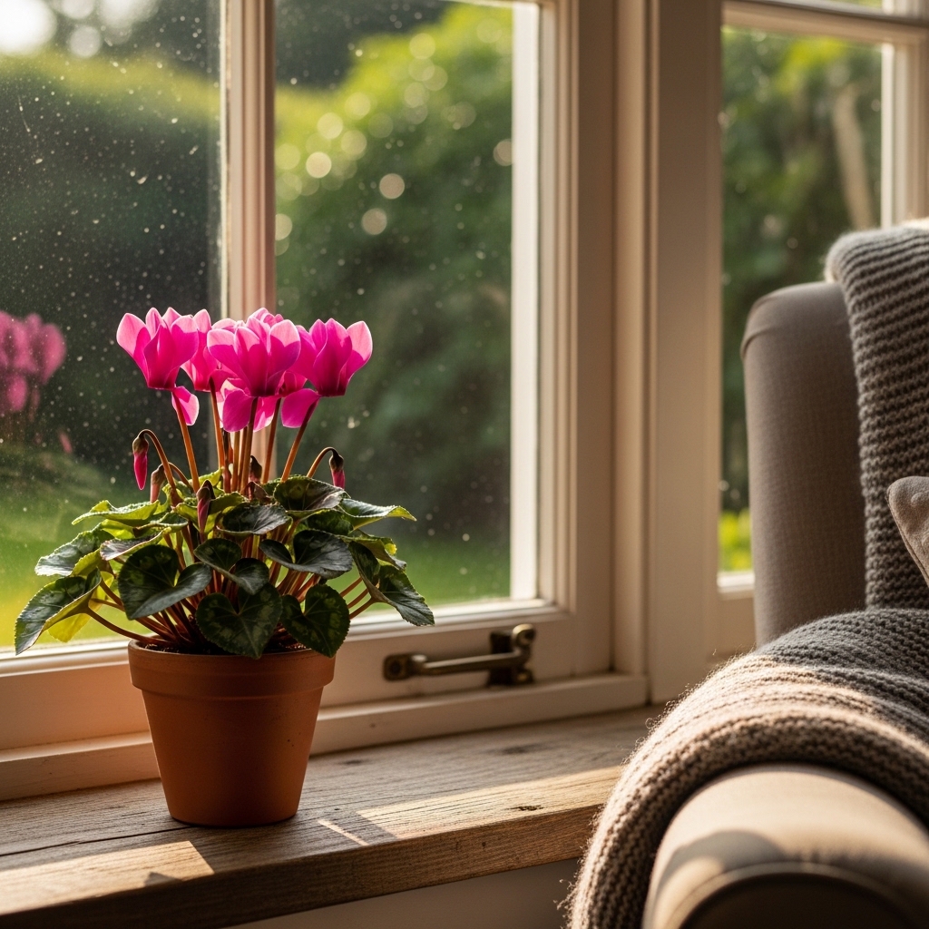 Place a potted cyclamen on the windowsill. The blooms will last for weeks. The green leaves are patterned.