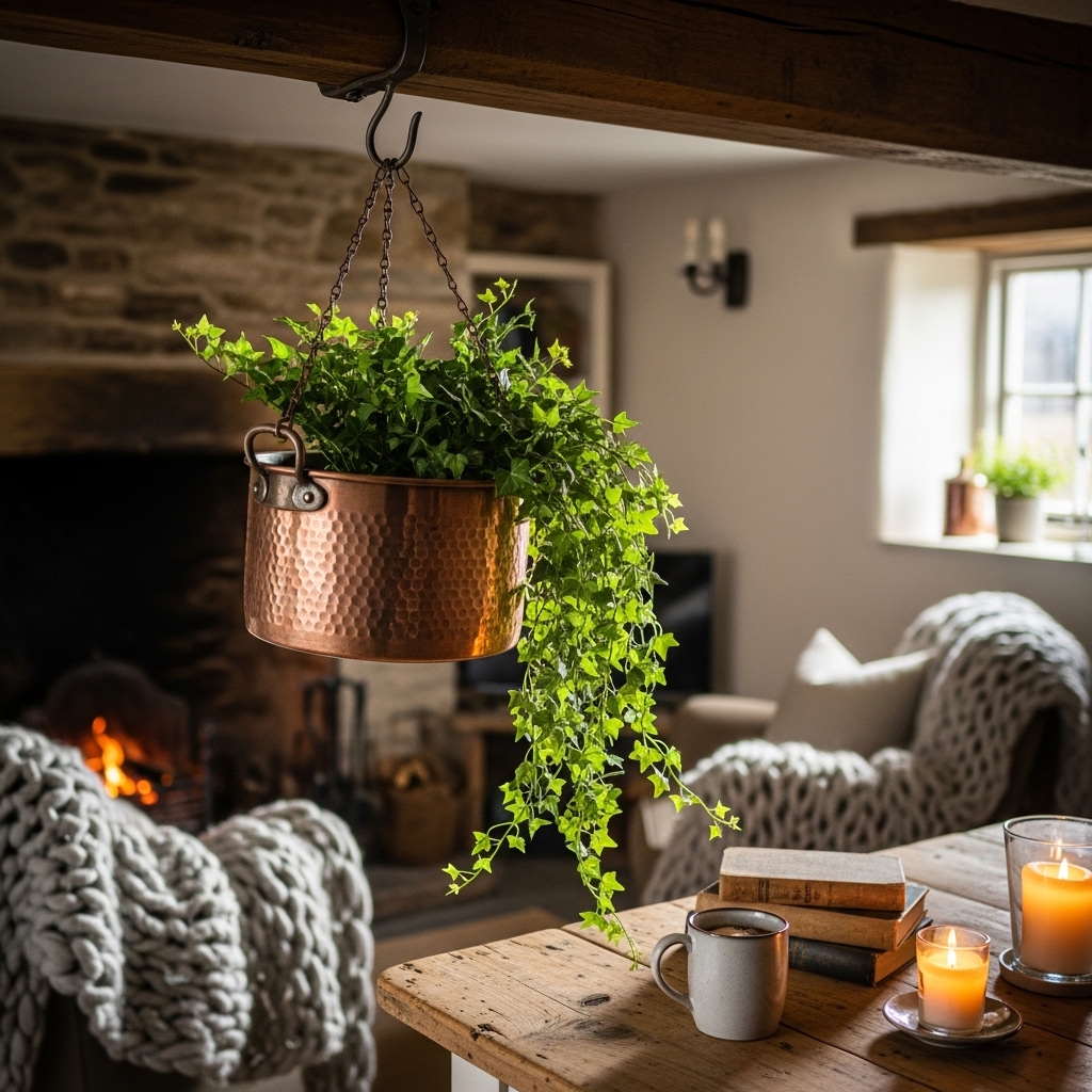 Hang a copper pot from a ceiling hook. Fill it with trailing ivy or pothos. The vines will grow down.
