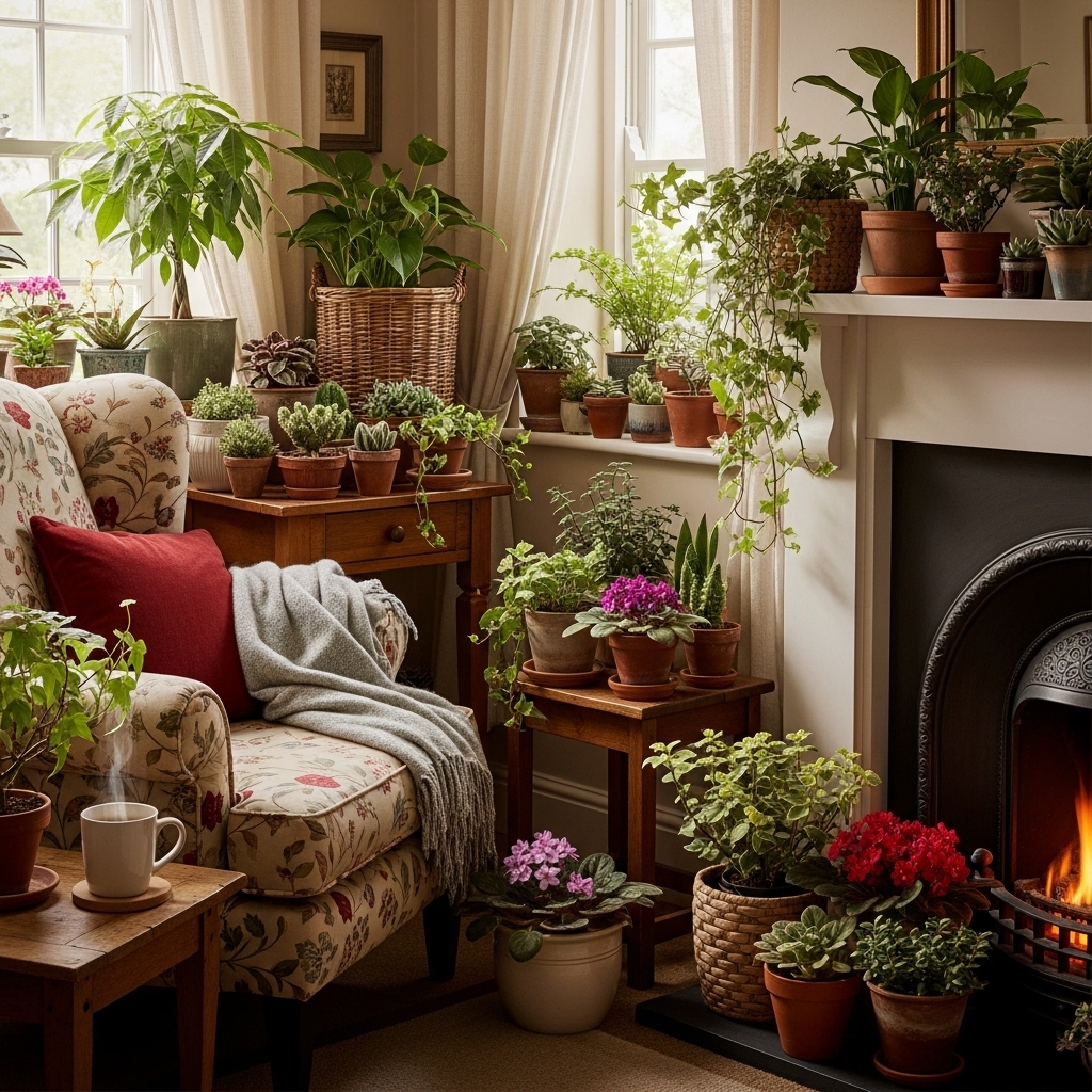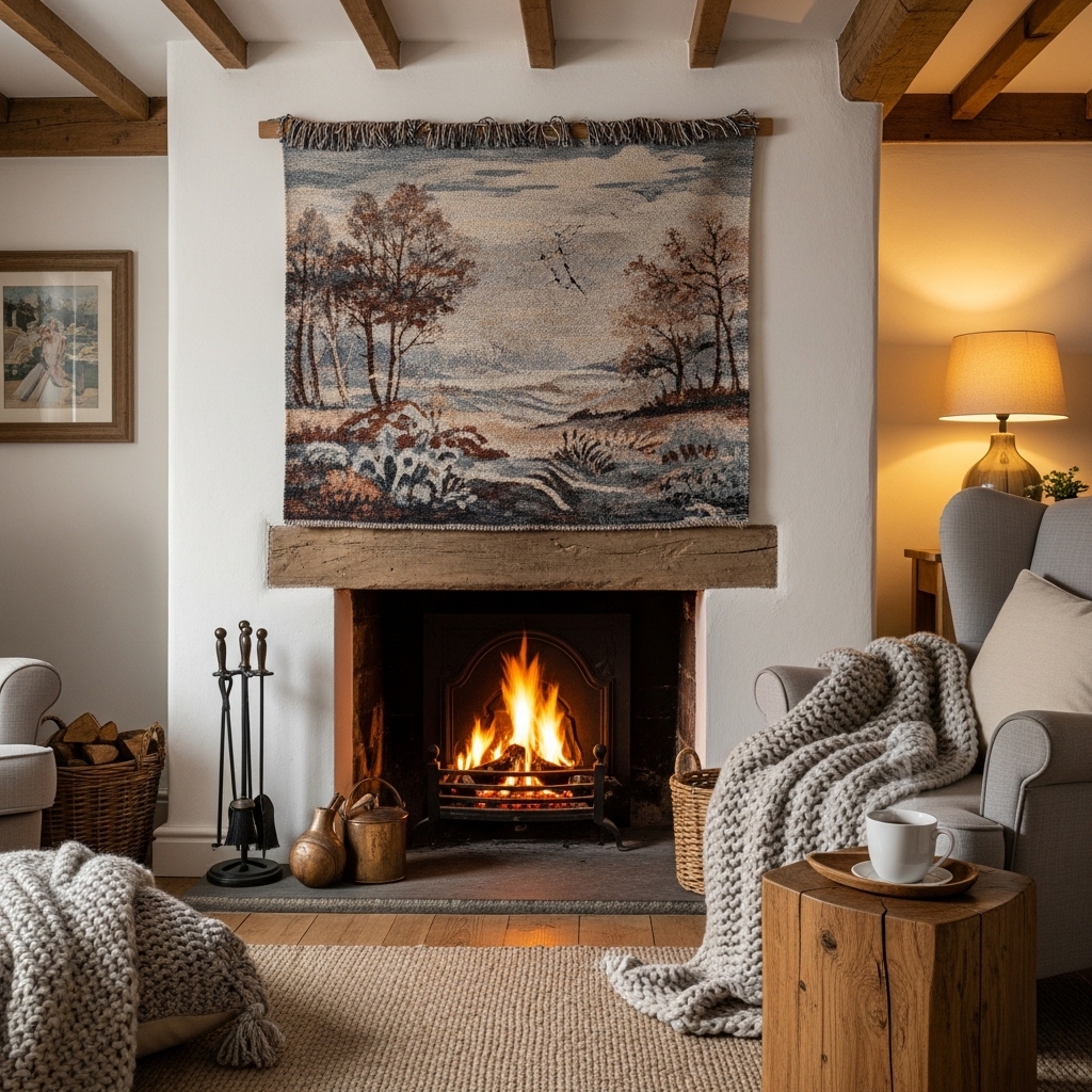 Cozy cottage interiors are about warmth, softness, and comfort. Sheepskin rugs layered over jute. Wool blankets draped over every chair. Velvet pillows on sofas. Candles on coffee tables. Heavy curtains over sheers. Baskets of logs by the fireplace. Potted plants on every surface. Macrame curtains in doorways. Sherpa throws on reading chairs. Bowls of potpourri. Woven tapestries on walls. Flannel throws. Ceramic mugs on coffee tables. String lights behind sofas. Woven baskets of blankets. Potted cyclamen on windowsills. Copper pots filled with greenery. Needlepoint pillows. Glass cloches over candles. And the fireplace lit.