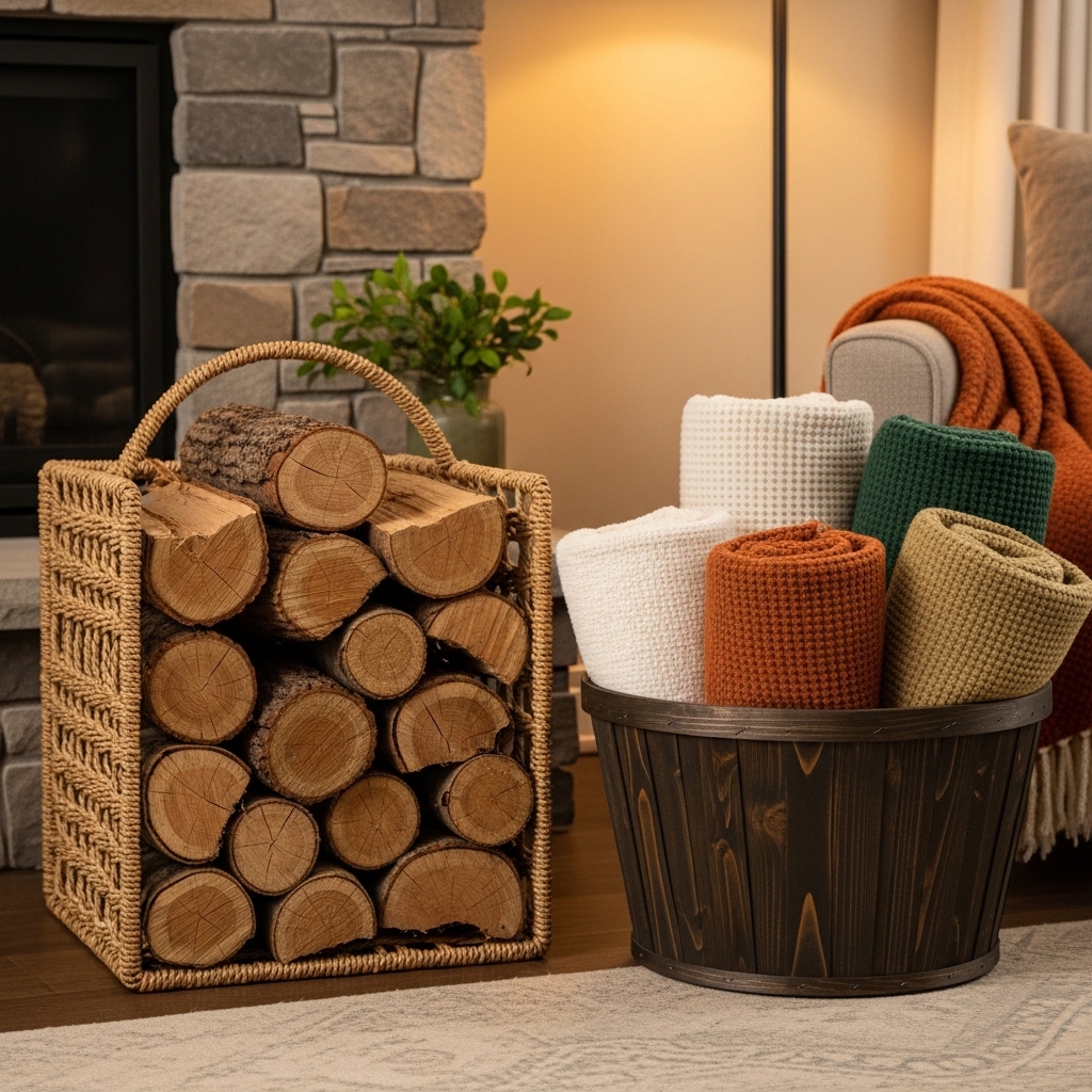 Use baskets to store firewood, blankets, or magazines for practical warmth.