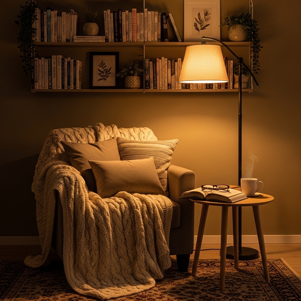 Create a dedicated space with a comfortable chair, small side table, lamp, and blankets. It encourages relaxation and quiet moments.