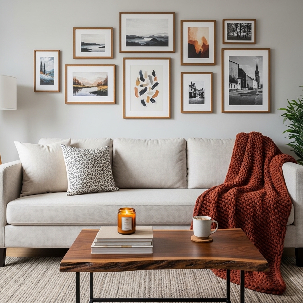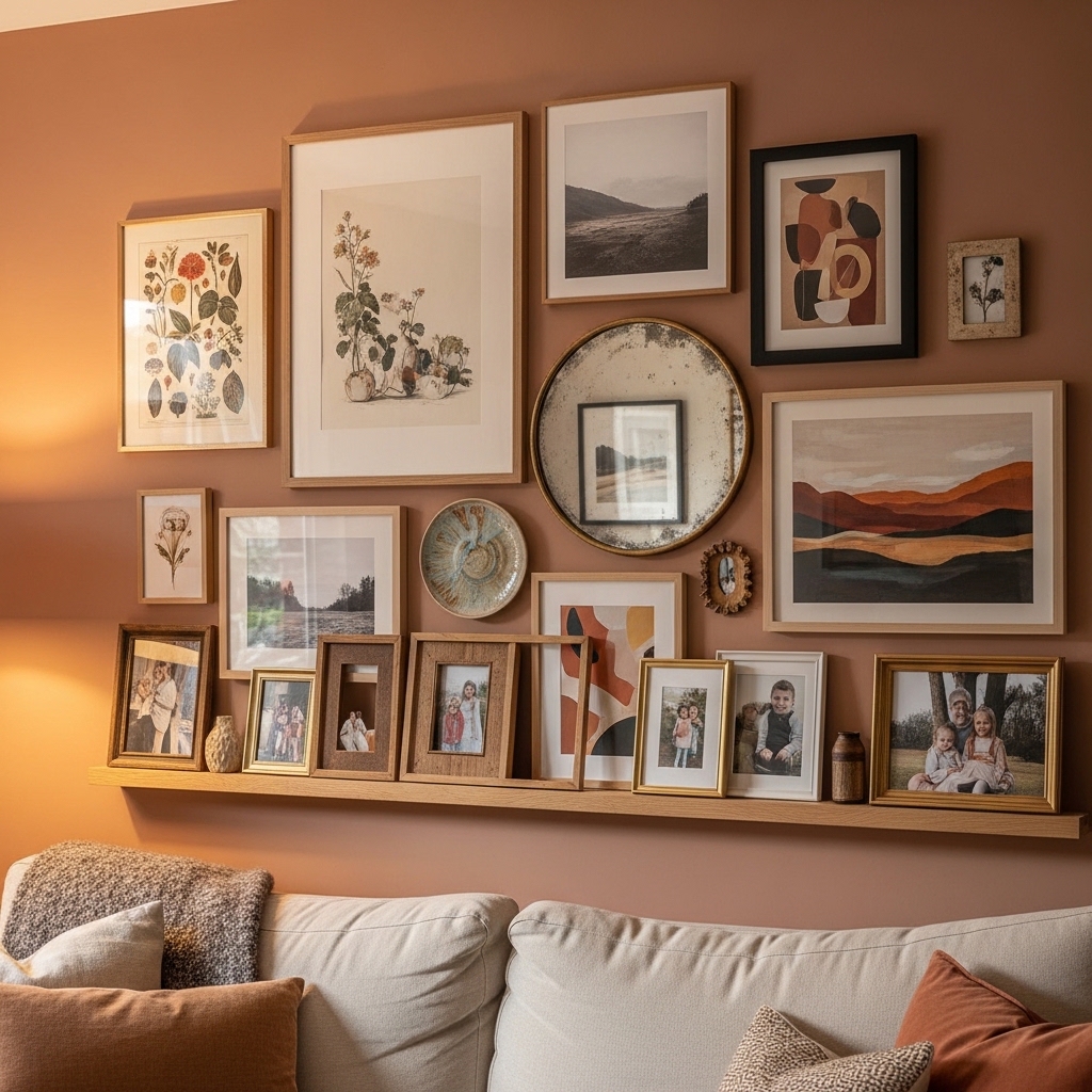 Why it works: Galleries add personality, visual interest, and warmth, making the room feel curated.