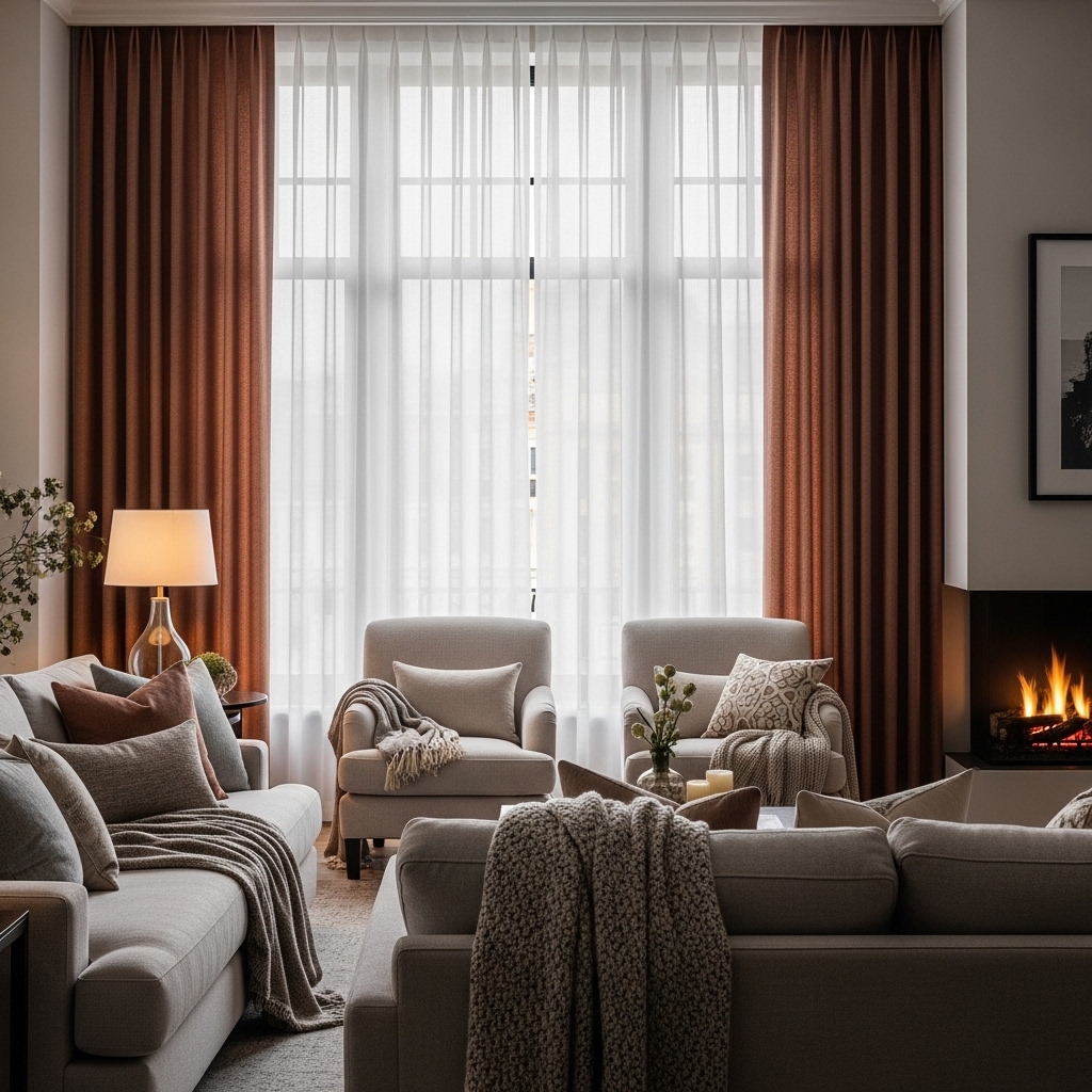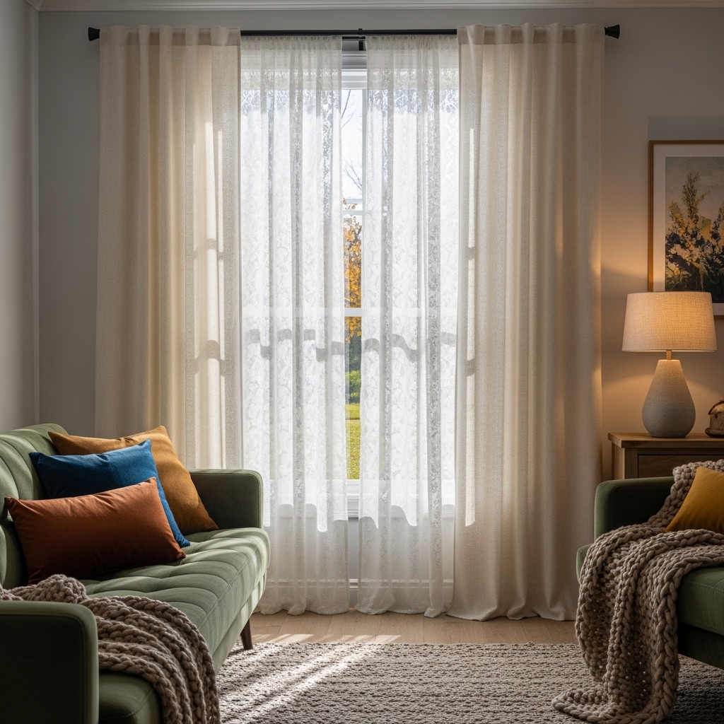 Why it works: Adds depth, controls light, and creates a soft, inviting look.