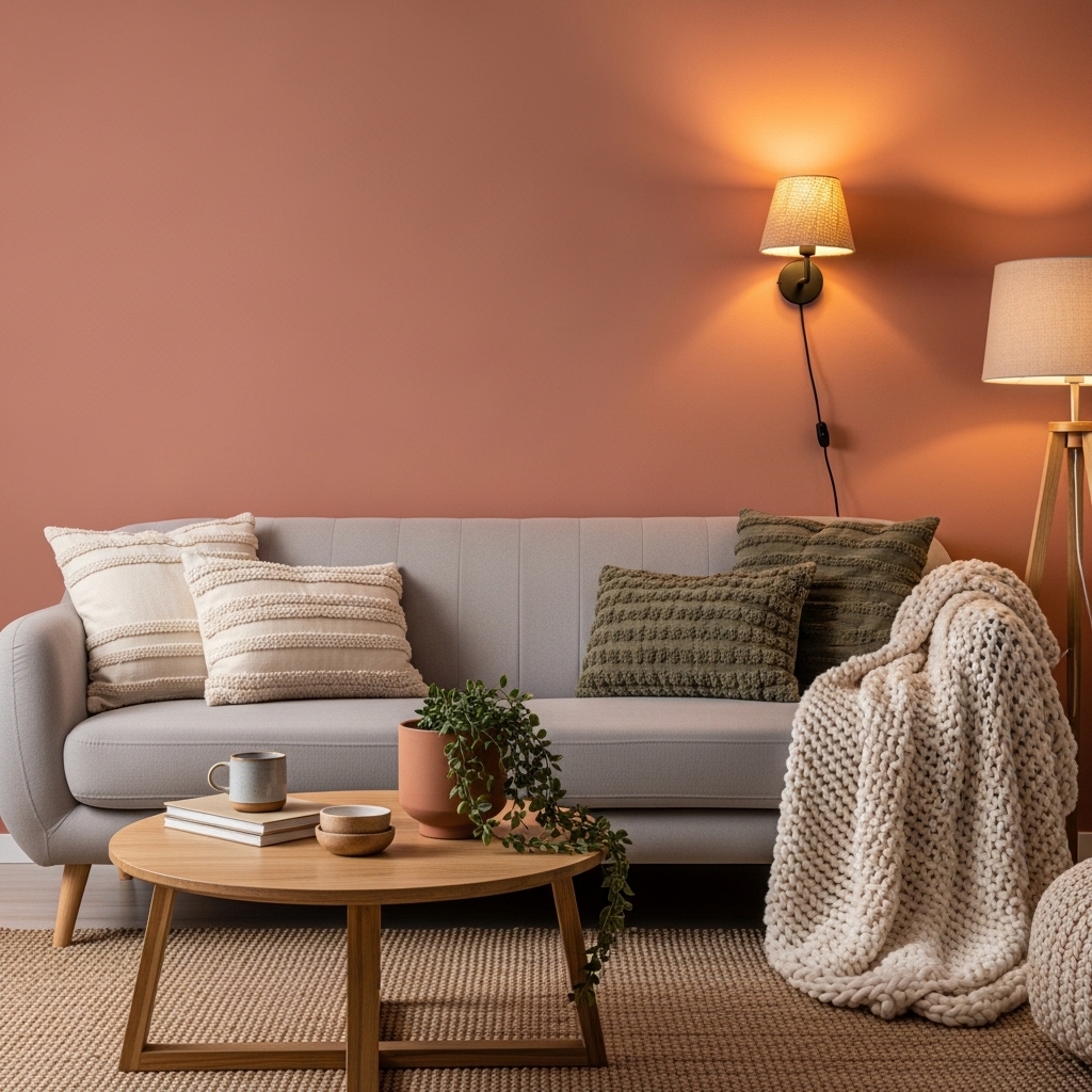 Start with neutral walls and furniture (beige, cream, or light gray) and layer warm accent tones like terracotta, mustard, or olive green in accessories and decor.