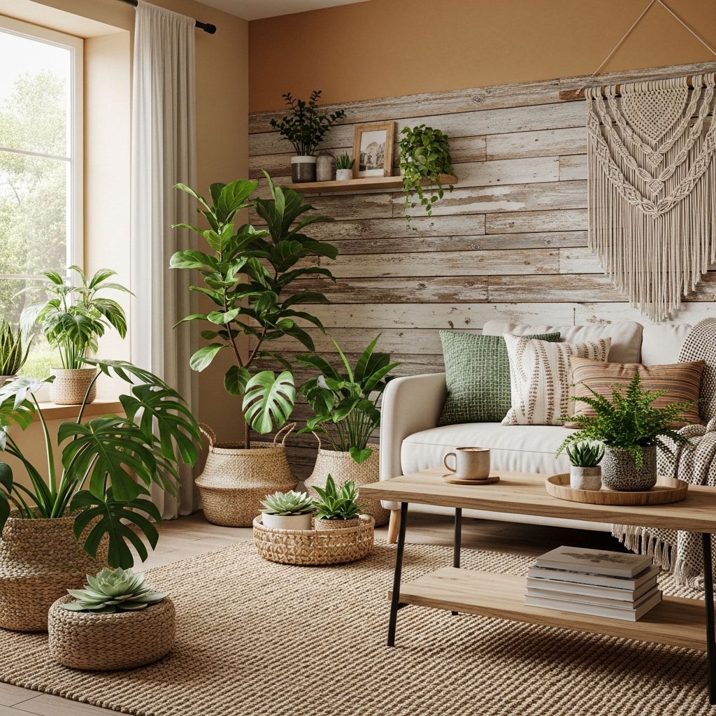 Why it works: Natural textures and greenery soften hard edges and make the living room feel alive and cozy.