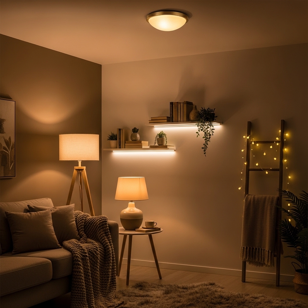 How to apply: Use warm LED bulbs with dimmers and place lights behind sofas, near reading chairs, or on side tables.