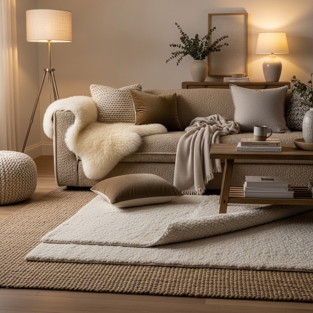 Layering rugs, throws, and cushions adds warmth, texture, and depth. Mix materials like wool, cotton, and faux fur to create a tactile, inviting environment.