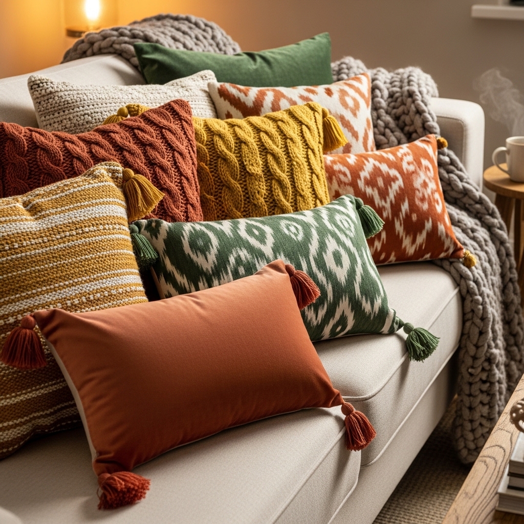How to apply: Start with large base pillows, add medium, then small patterned cushions. Rotate seasonally.