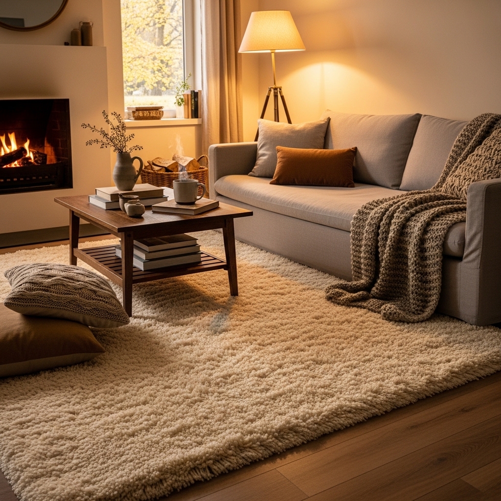 A large, soft area rug defines the seating area and adds warmth underfoot. Layering smaller rugs can create visual depth.