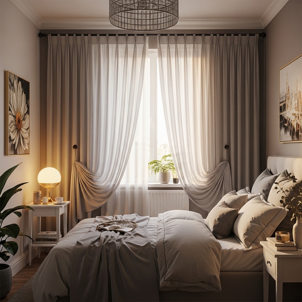 Curtains can soften the appearance of a bedroom while improving comfort and privacy. Light fabrics allow natural light to enter while maintaining warmth.