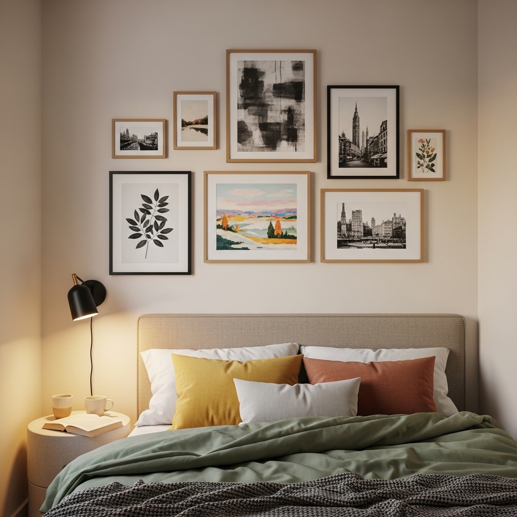 A gallery wall adds personality without requiring large furniture pieces. Framed prints, photos, or artwork can transform a plain wall into a stylish feature.