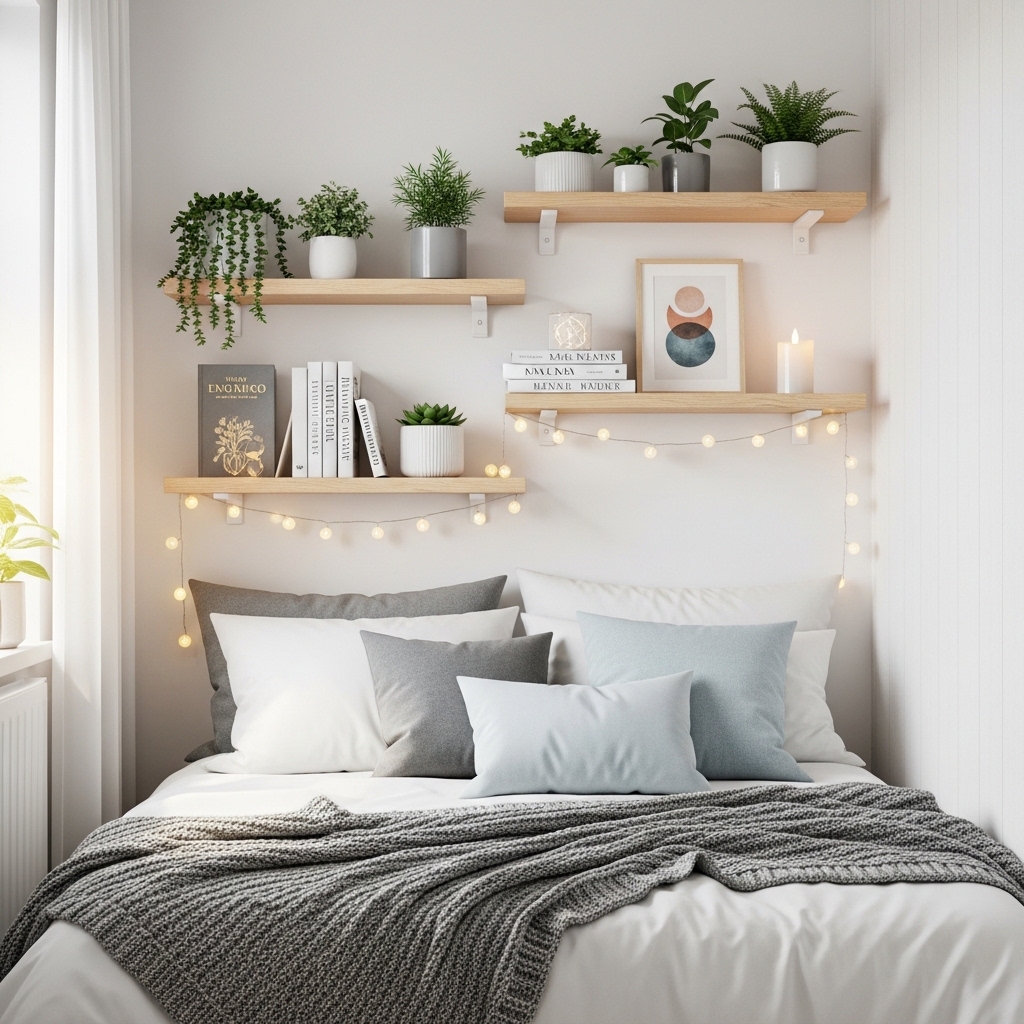 Floating shelves are perfect for small bedroom decor because they add storage without using floor space.