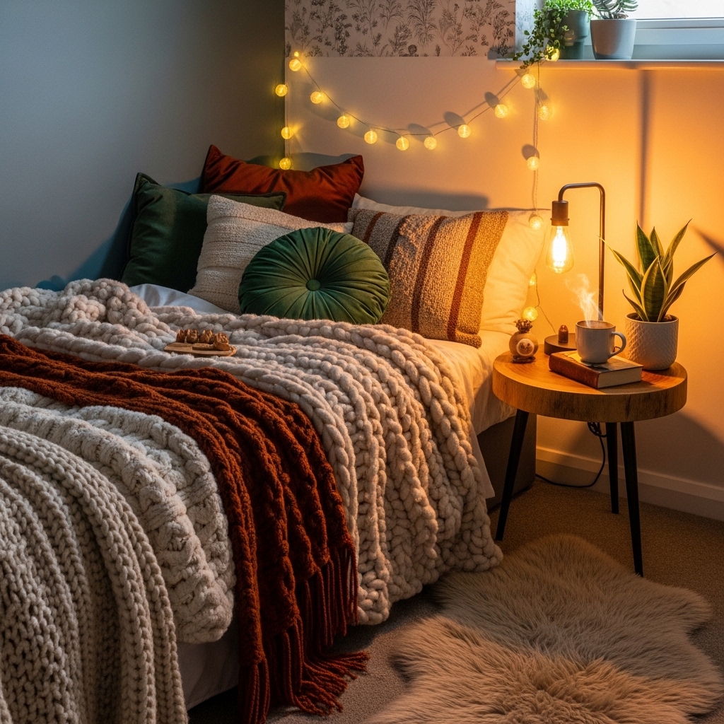 Lighting plays a huge role in creating a cozy bedroom atmosphere. Warm bedside lamps, fairy lights, or soft LED lighting can transform the mood of the room.