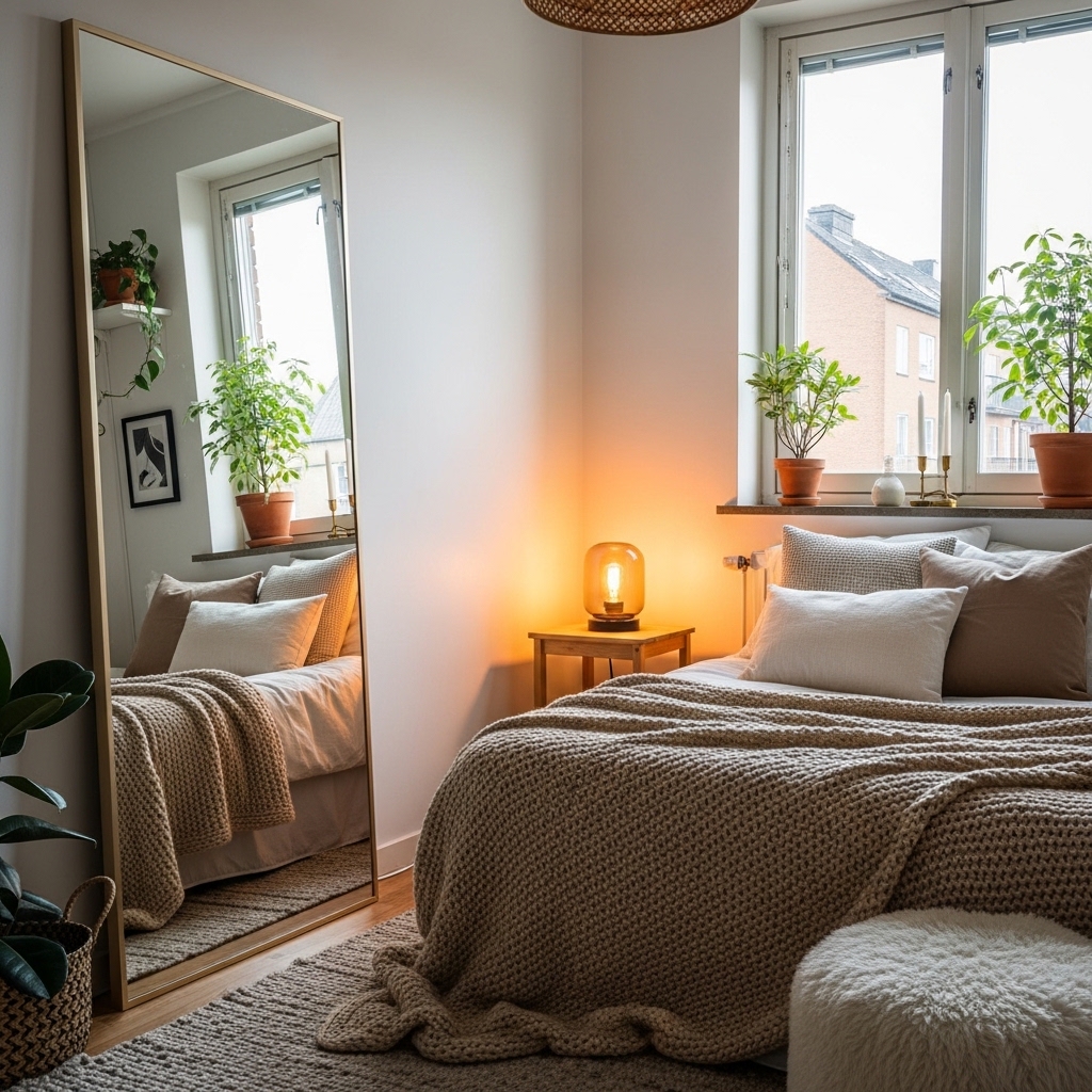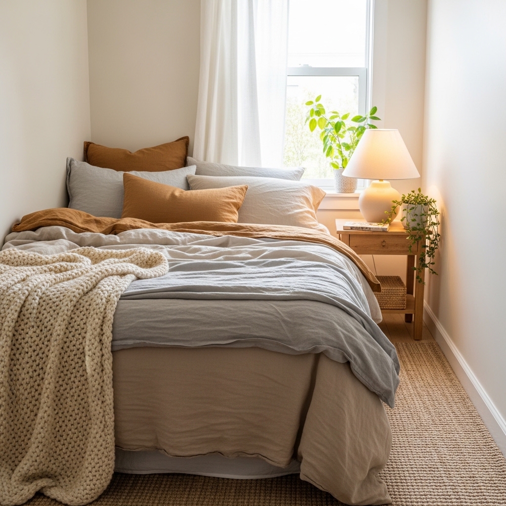 Soft neutral bedding instantly makes a small bedroom feel warm and inviting. Shades like cream, beige, and soft gray create a calming atmosphere while helping the room look brighter and more spacious.