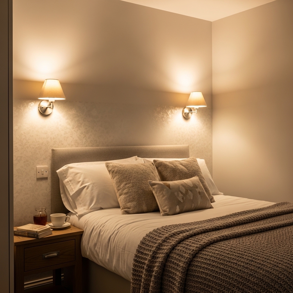 Soft lighting reduces harsh shadows and makes the space feel more relaxing. It also highlights decor details like bedding and wall art.