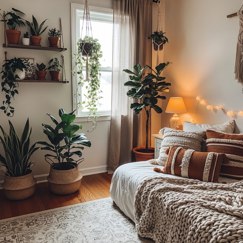 Plants bring freshness and natural beauty to a bedroom. Even small plants on shelves or nightstands can enhance the cozy environment.