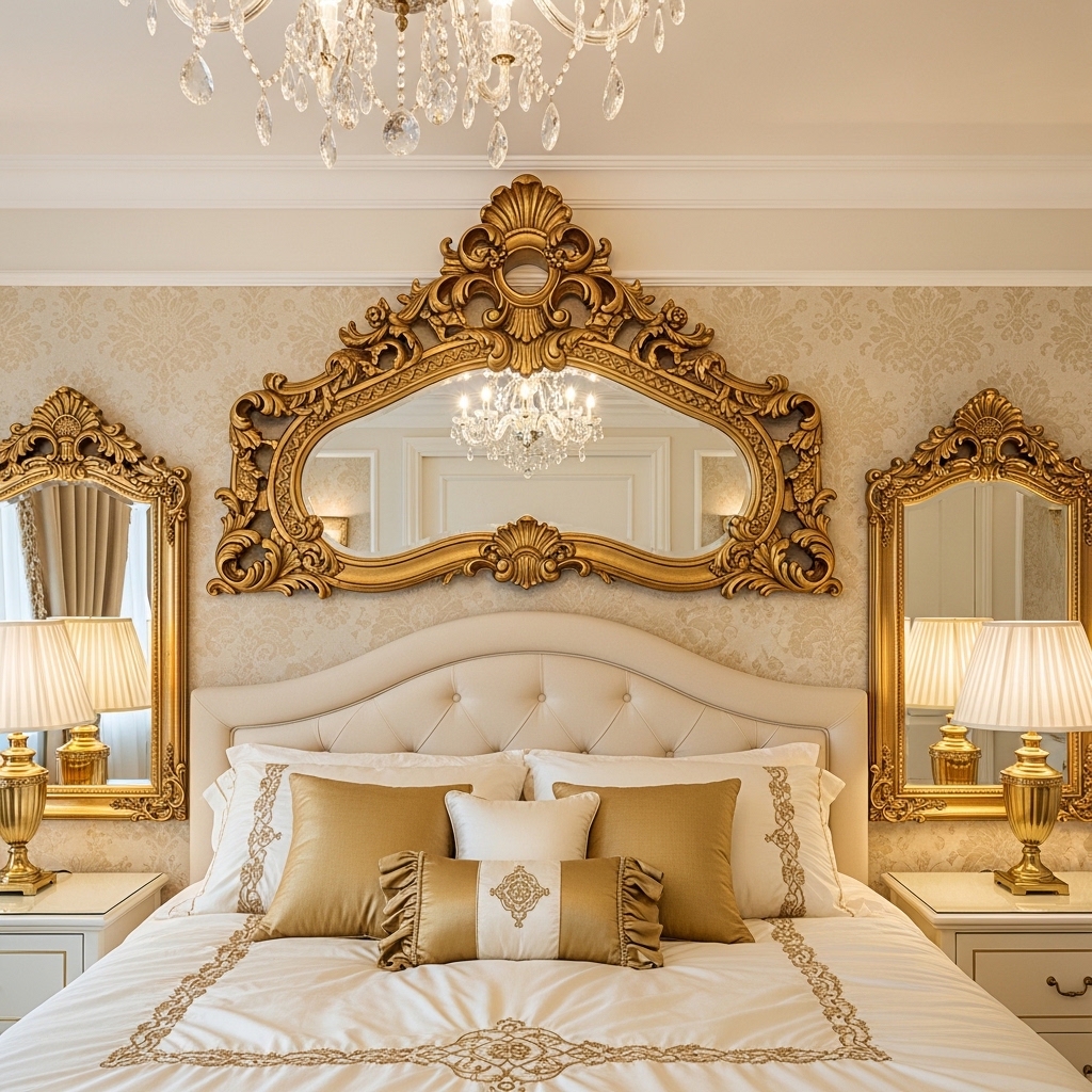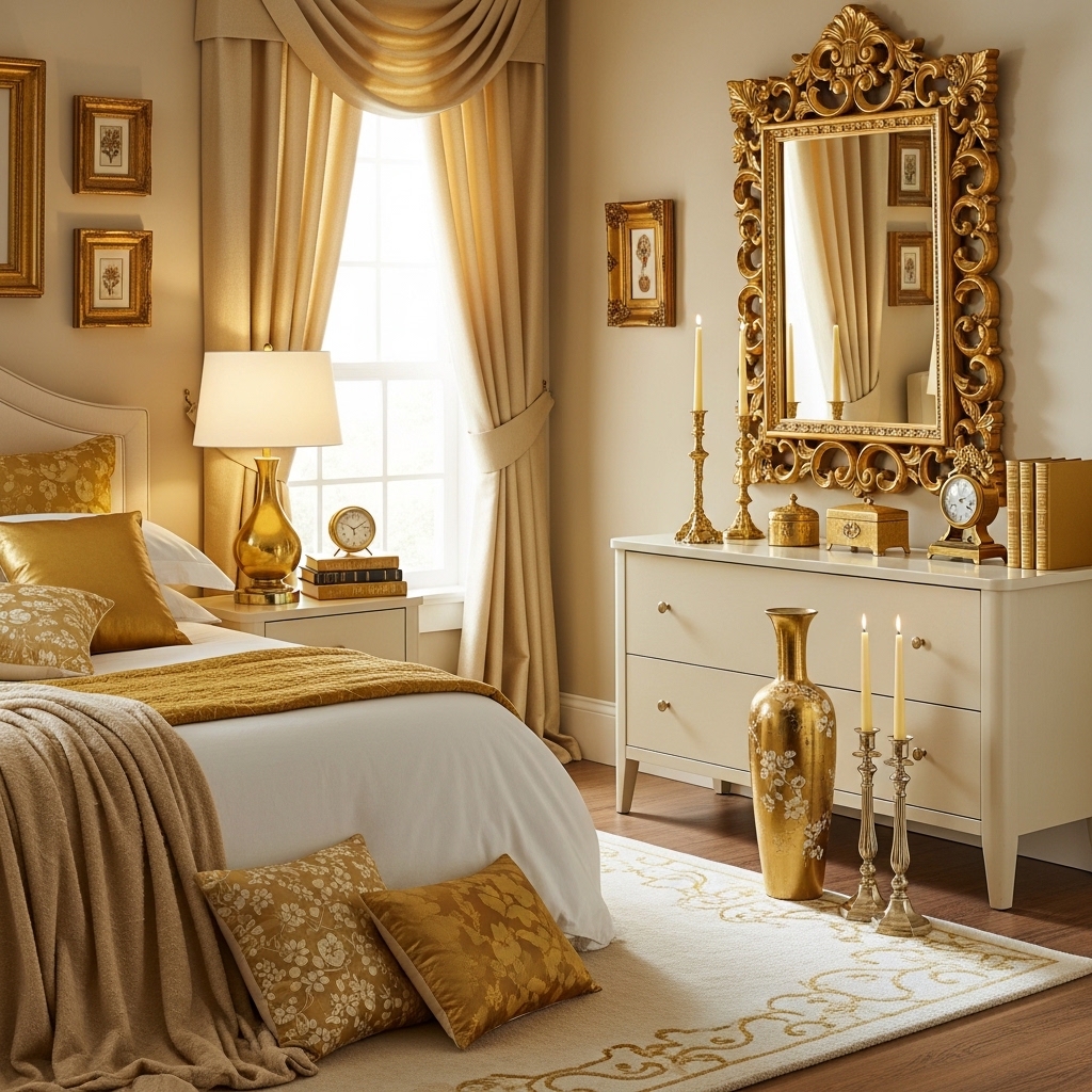 A gold-framed mirror acts as both a functional and decorative element. It reflects light, making the room appear larger while adding a luxurious touch.