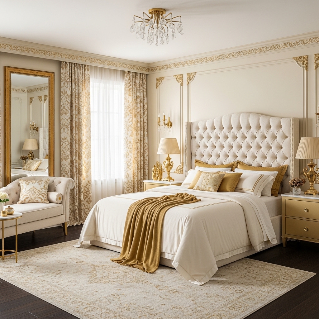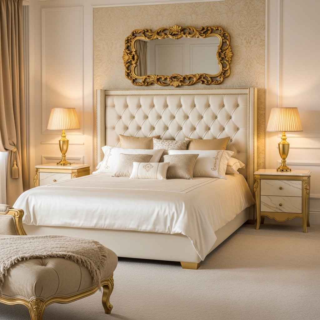 A cream upholstered bed adds softness and comfort, while subtle gold details elevate its appearance. This combination creates a balanced and elegant focal point.