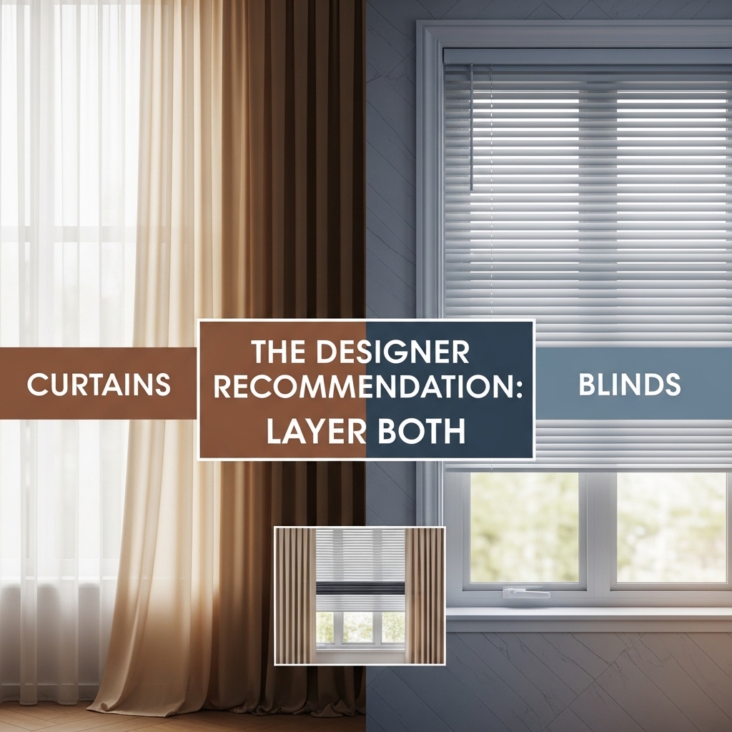 Most interior designers recommend both blinds and curtains. Blinds provide light control and privacy. Curtains provide softness, color, and warmth. Together, they create a finished, layered look.