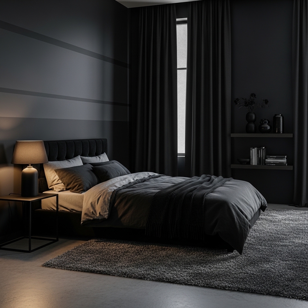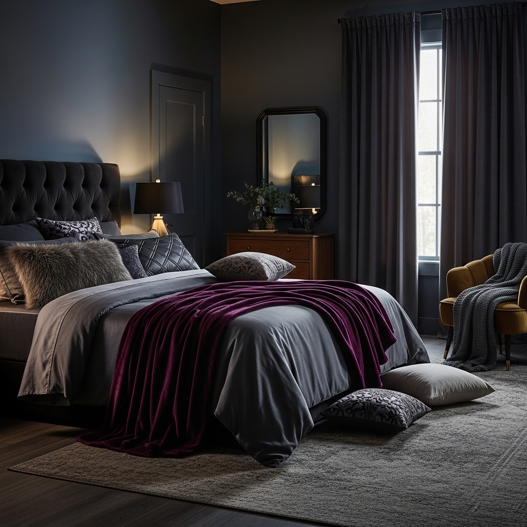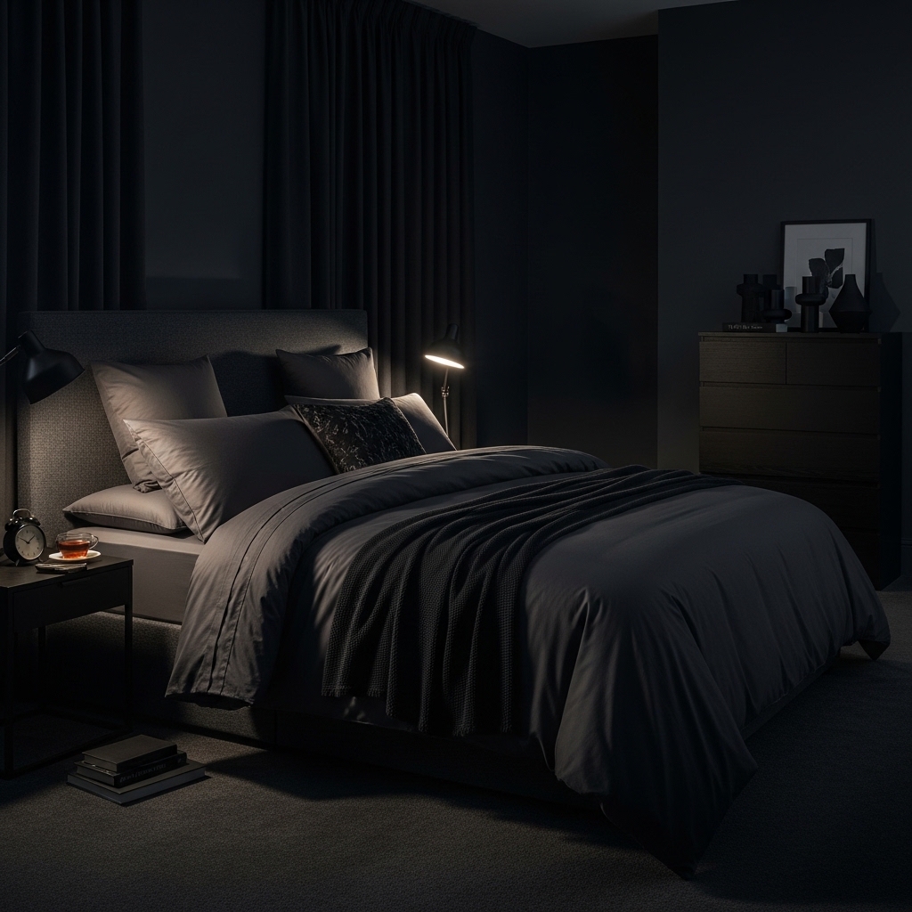 Velvet, suede, and other rich fabrics enhance the luxurious feel of a dark bedroom. These materials reflect light subtly, adding depth and softness to the space.