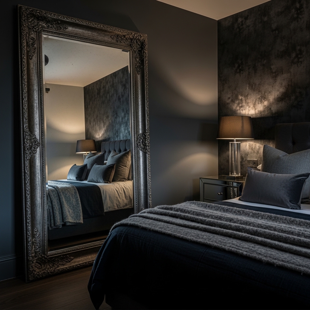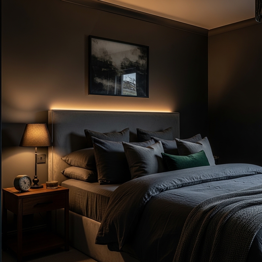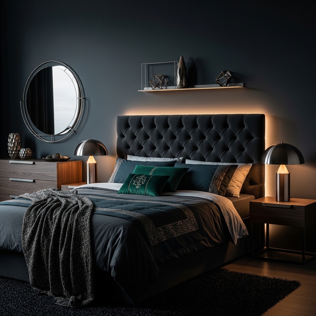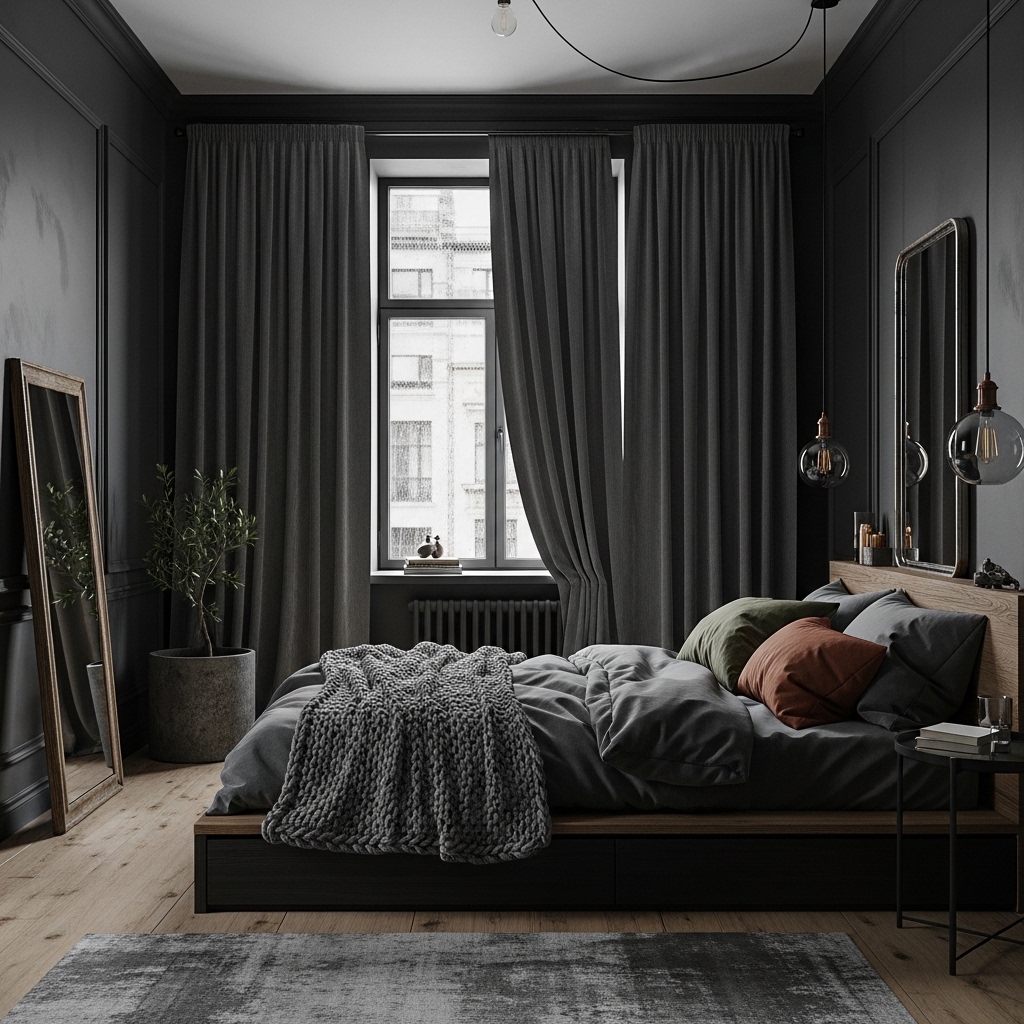 Velvet, suede, and other rich fabrics enhance the luxurious feel of a dark bedroom. These materials reflect light subtly, adding depth and softness to the space.