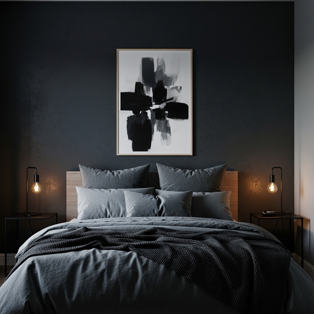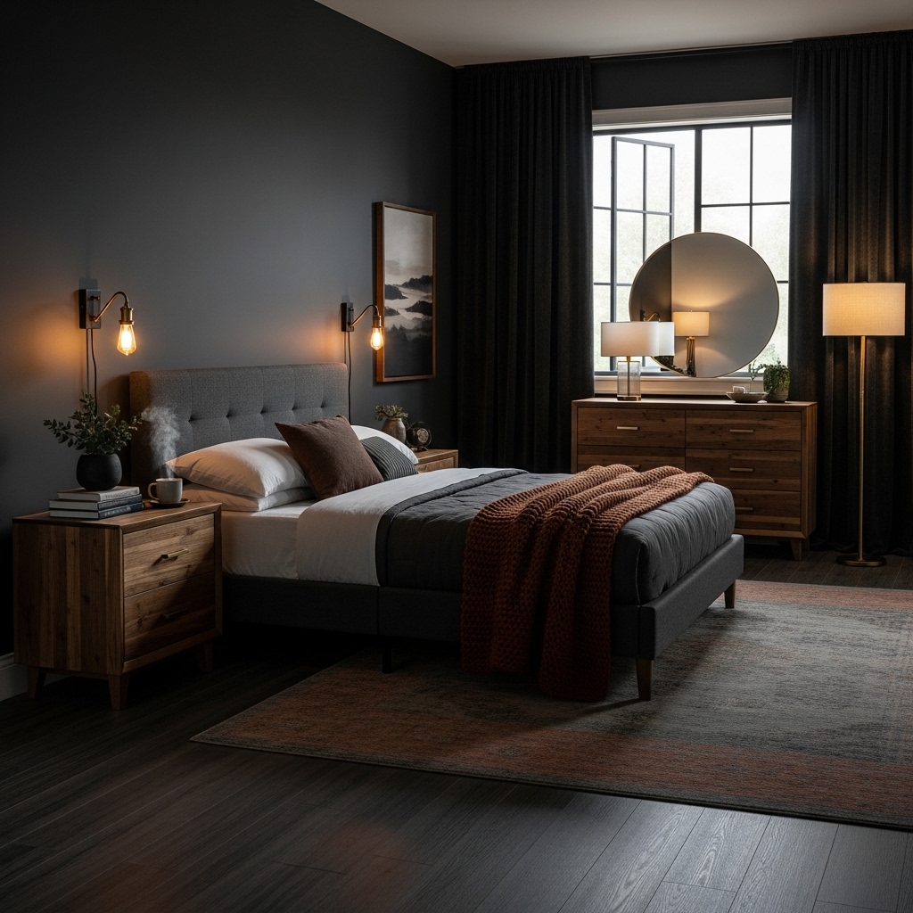 It works well in both small and large rooms when paired with lighter bedding or warm wood accents. The contrast prevents the space from looking flat or overwhelming.