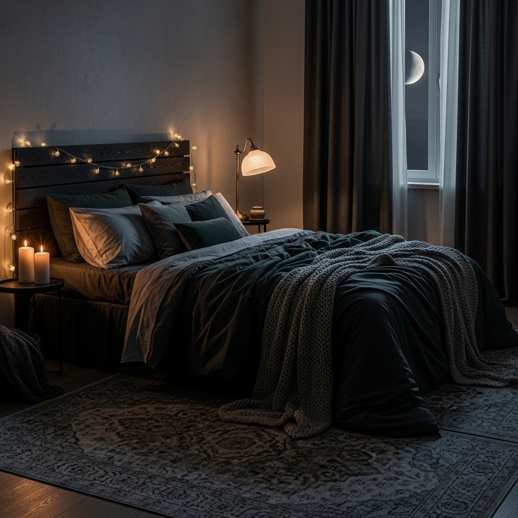 Lighting is one of the most important elements in a dark bedroom. Soft, warm lighting creates a cozy glow that enhances the moody aesthetic without making the room feel too dim.
