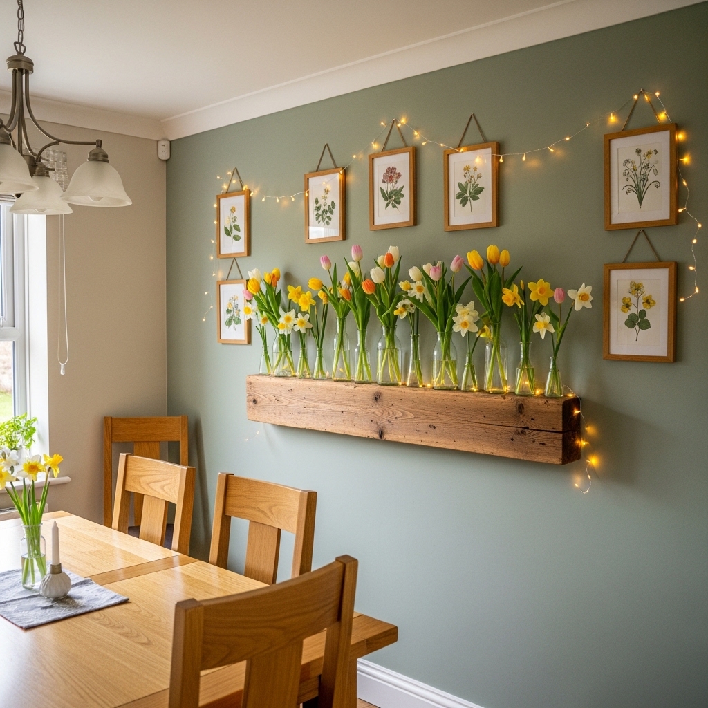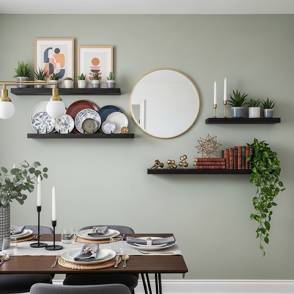 Install floating shelves and style them with plates, small art pieces, plants, or decorative objects. Keep arrangements minimal and balanced.